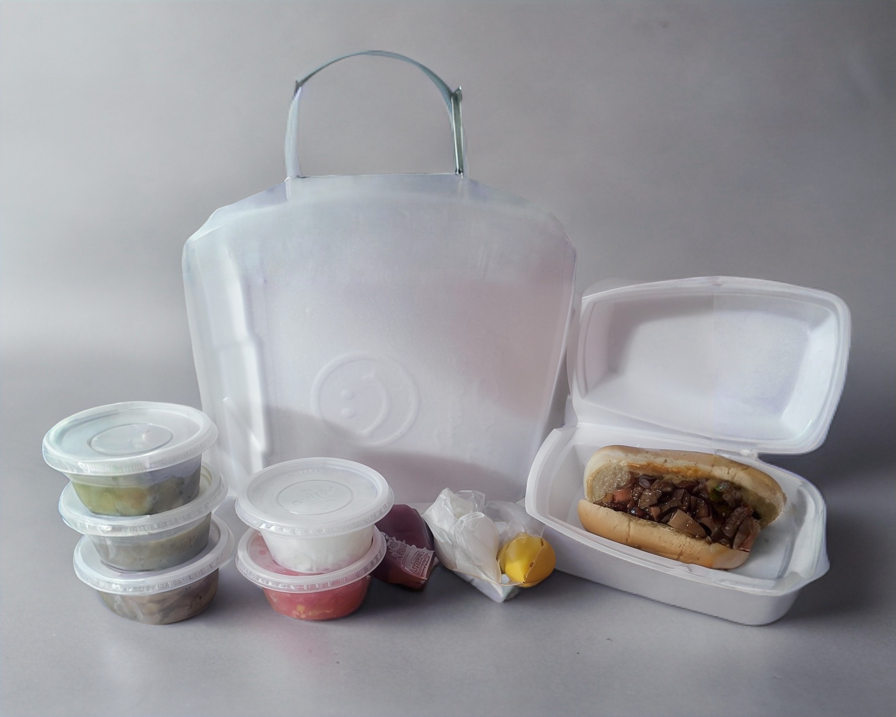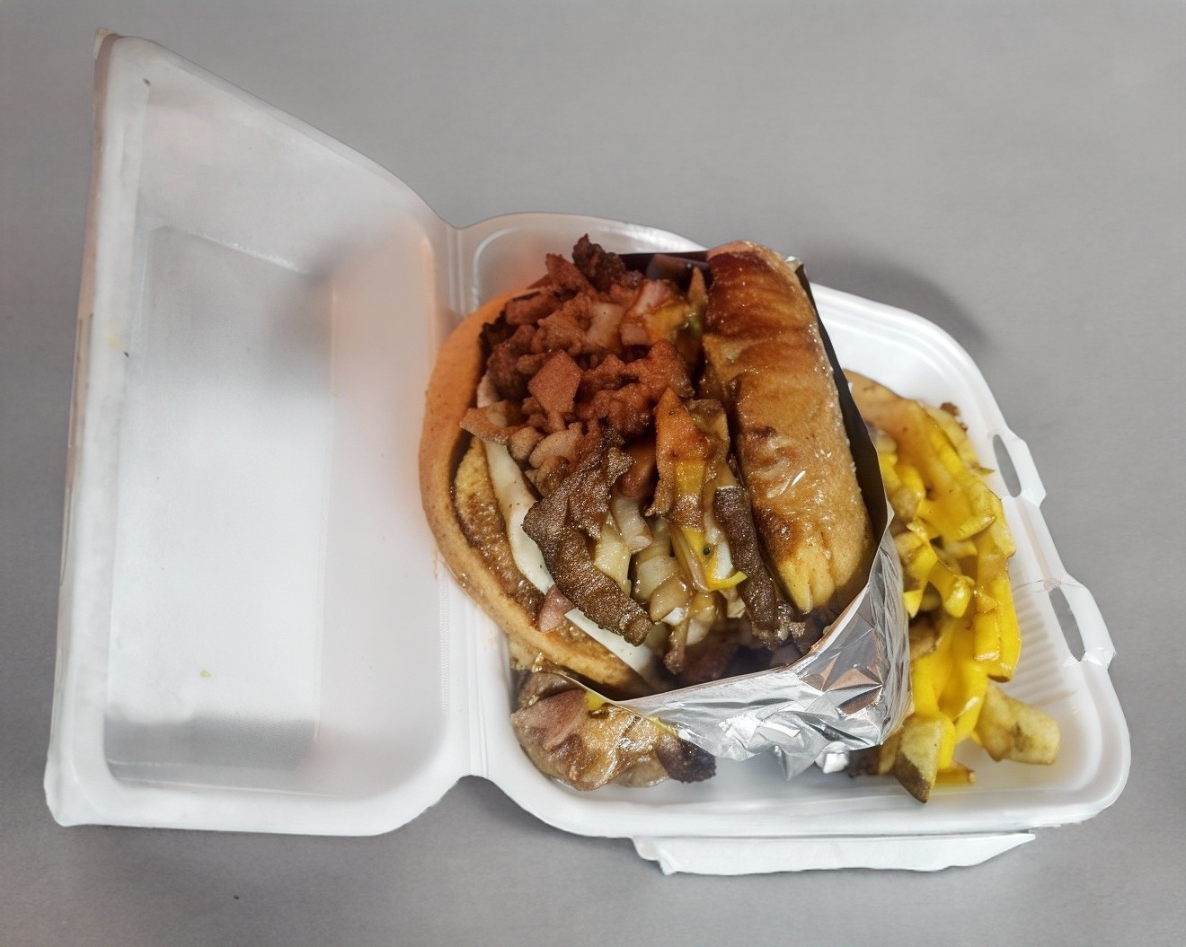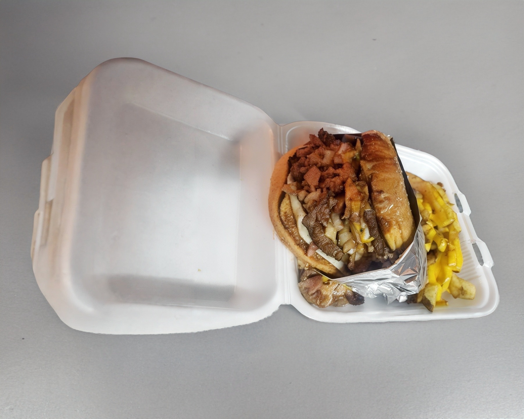 Carne de res, queso amarillo, lechuga, tomate, cebolla, cátsup, mayonesa y mostaza, acompañada de papas a la frencesa..