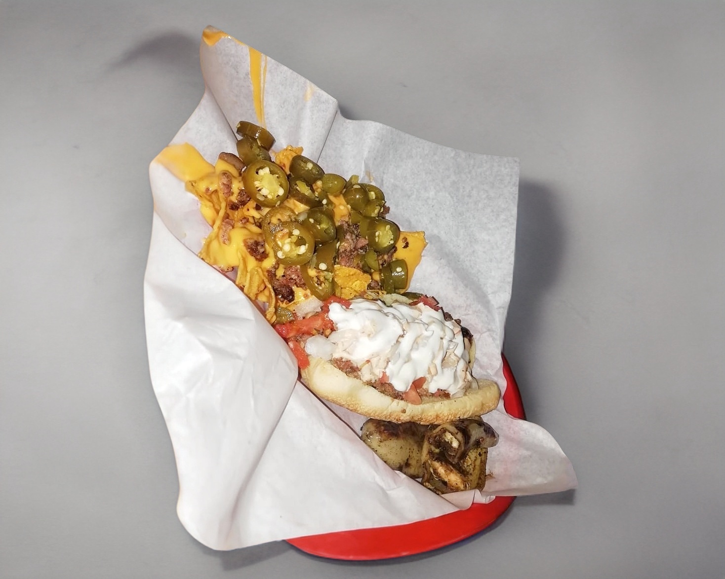 (Personal) Queso, chilli beans, tocino, cebollas y champiñones a la lancha y jalapeño de 350gr