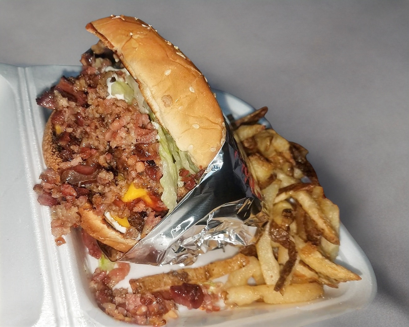 2 Carnes de res, doble tocino, 2 quesos amarillos, doble aros de cebolla, 1 buba, bañada en salsa BBQ, acompañada de papas a la francesa
