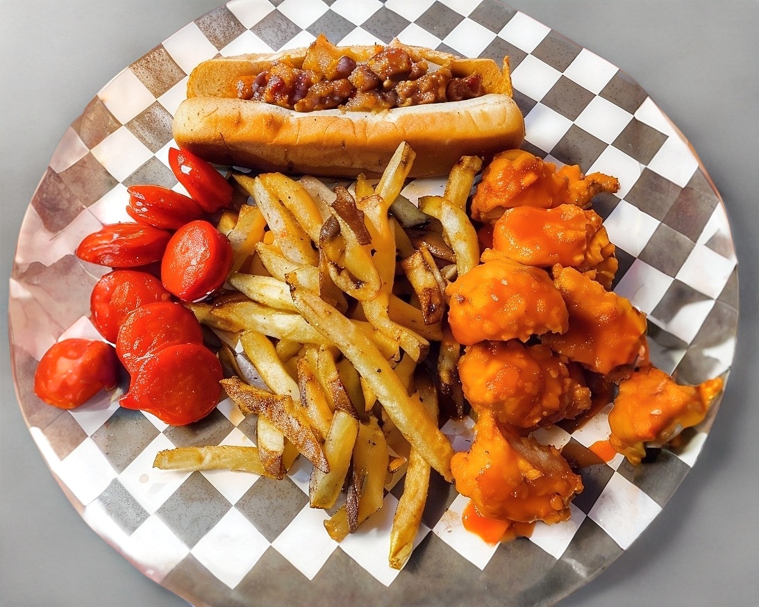 Hot Dog con Papas*1 + 1/2 Orden Boneless Bufálo*1 + !/2 Orded de Bubas*1
