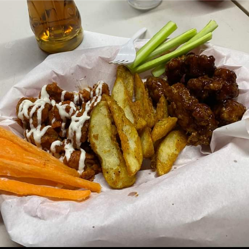 Orden de boneless 350 gr. pechuga de pollo bañada en salsa búfalo con papas sazonadas en gajo apios, zanahorias y aderezo ranch.