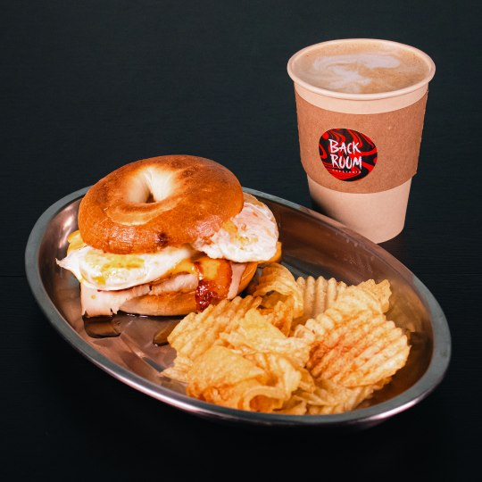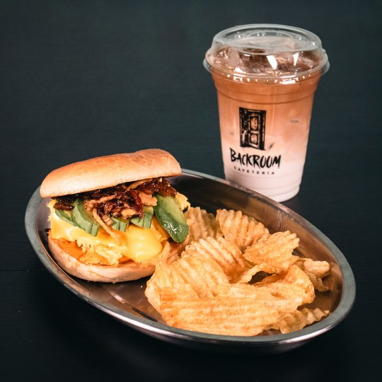 Huevo revuelto, queso cheddar, mermelada de tocino, cebollita frita, aguacate, aderezo chipotle.
