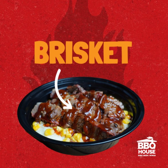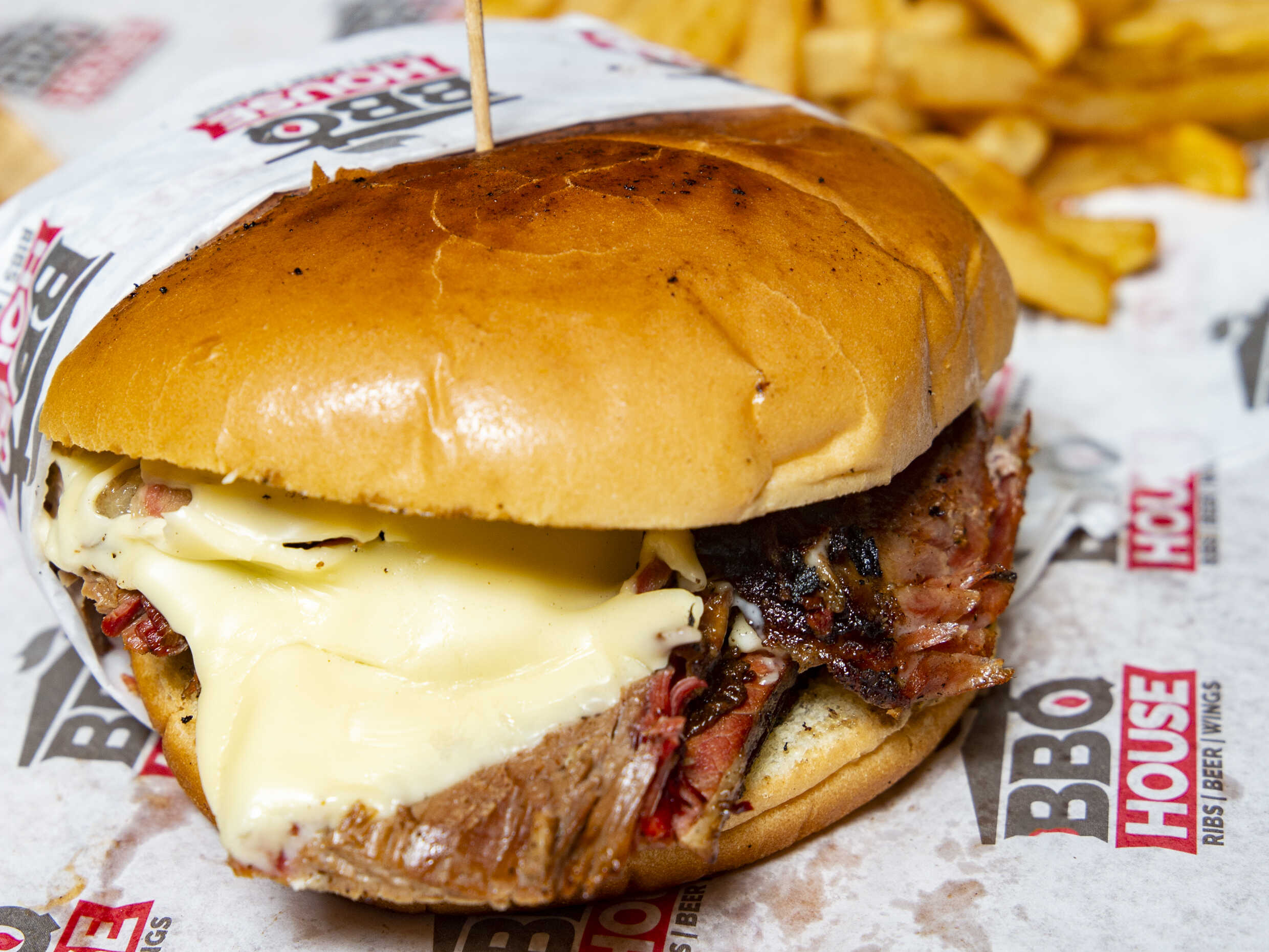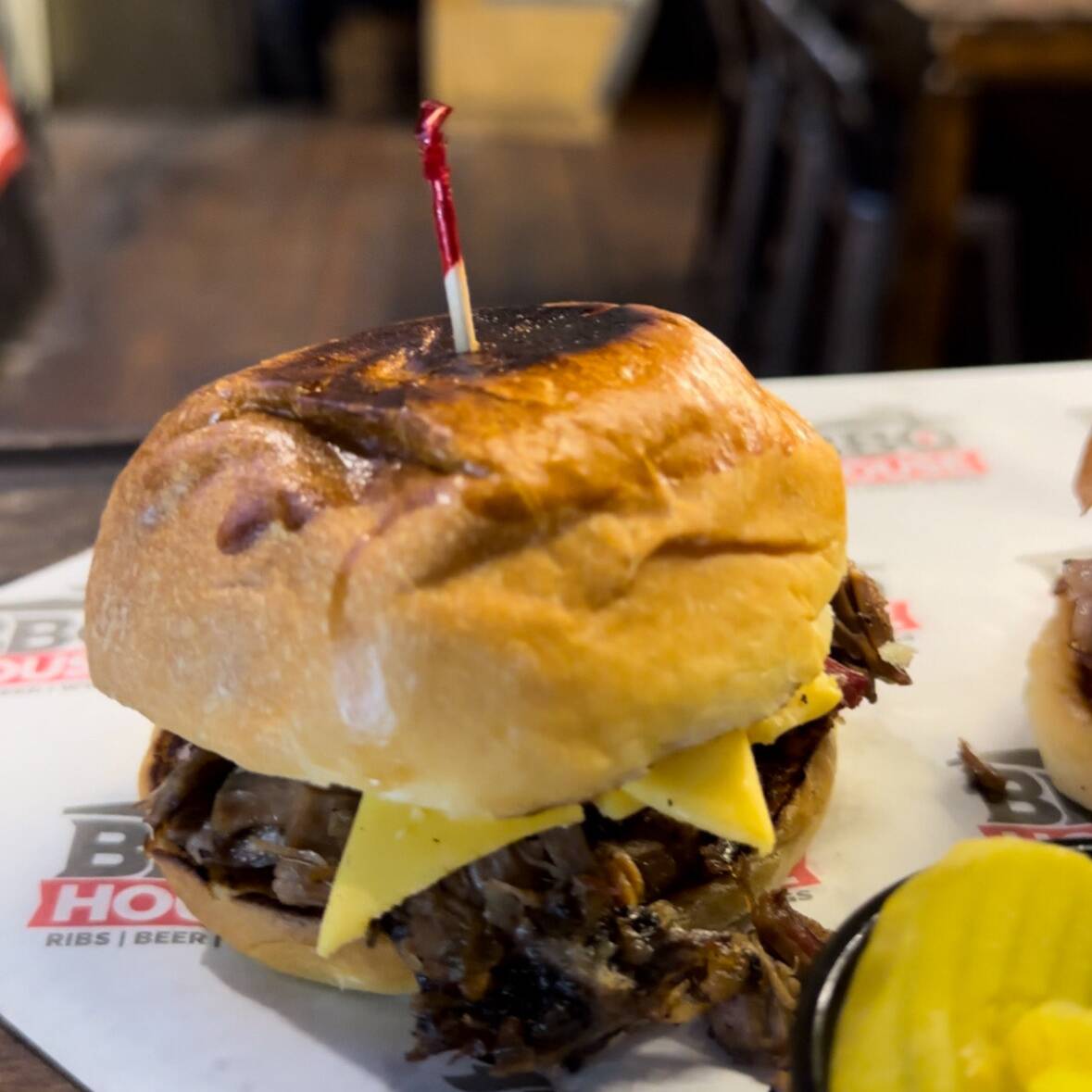 Jugoso pecho de res ahumado, queso amarillo montado en pan brioche.