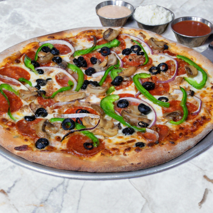 Queso, pepperoni, champiñones, aceitunas, morrón, cebolla y salchicha italiana