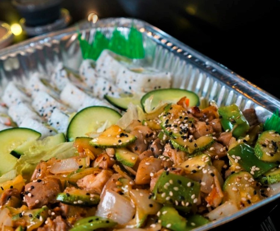 Media charola de teriyaki de pollo, acompañada de 2 rollos naturales (camarón y surimi).