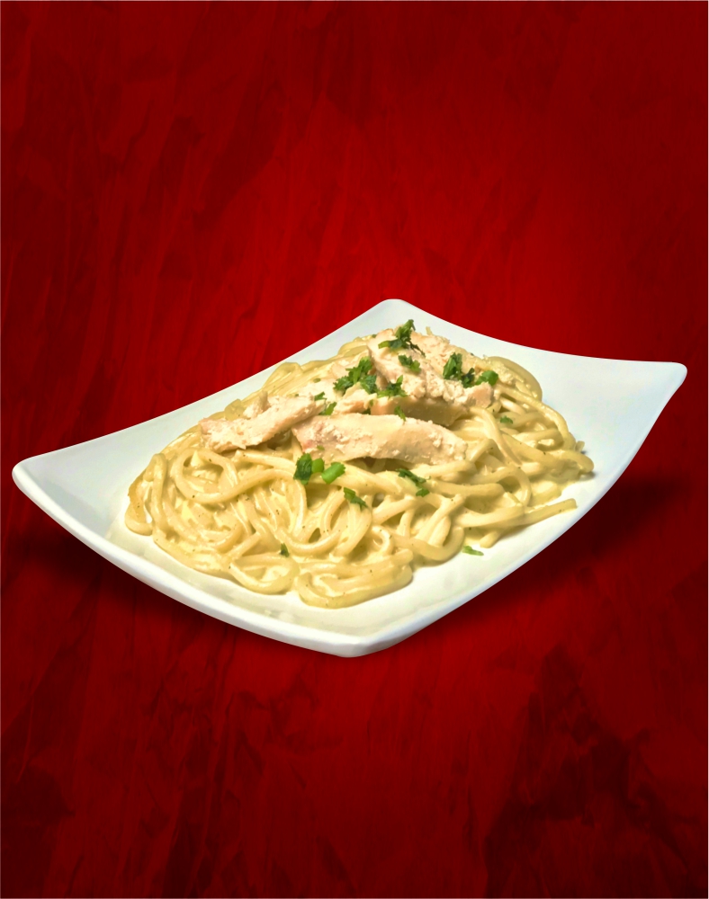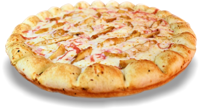 Pizza grande de 12 rebanadas: pechuga de pollo, queso, crema Alfredo, jamón y tocino.