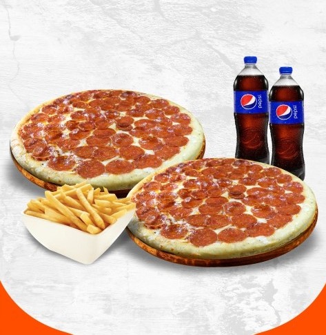 Incluye 2 pizzas medianas de pepperoni, más 1 orden de papas fritas, 2 refrescos a elegir.