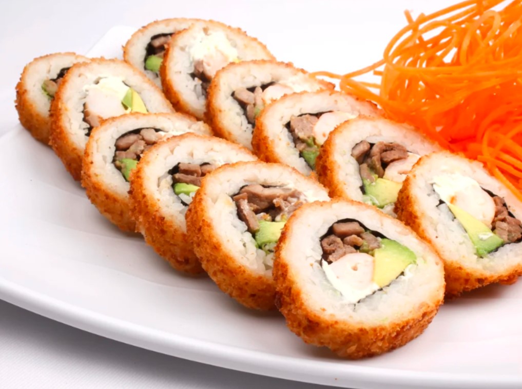 Rollo empanizado con camarón, pollo y res, queso Philadelphia.
