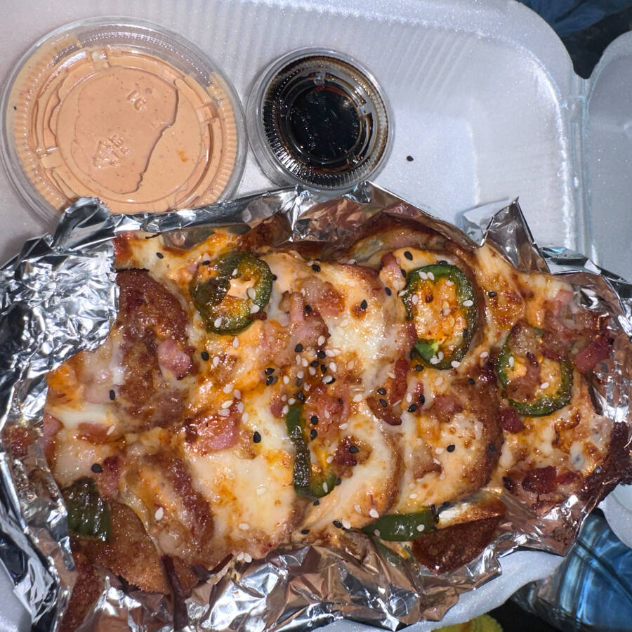 Pizza mediana de 8 rebanadas, base de Philadelphia-chipotle, queso mozzarella, papas fritas, boneless búfalo, bañados en aderezo chipotle, queso de nachos y aderezo ranch.