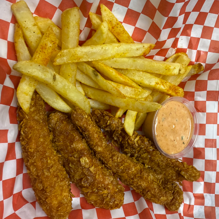 4 tiras de pollo + 200 gr de papas fritas y aderezo especial de la casa.