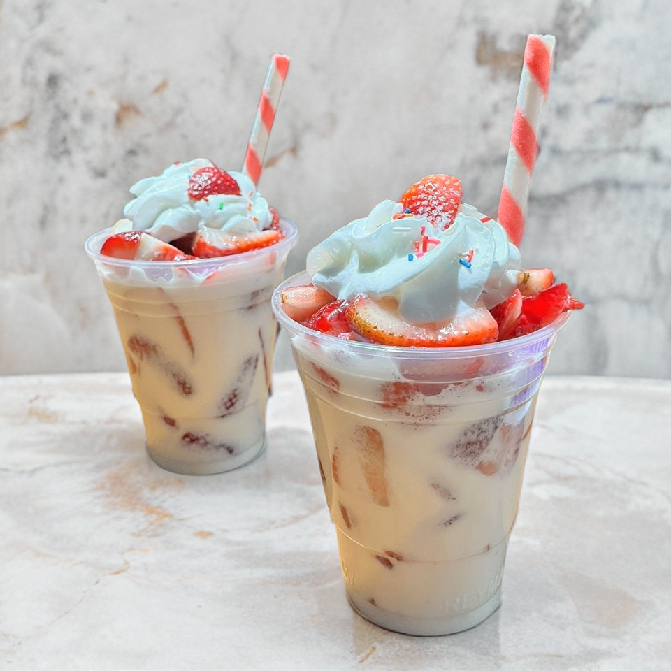 Fresas frescas servidas con crema dulce y un toque de leche condensada.