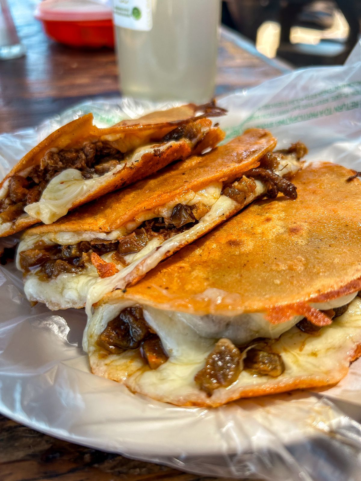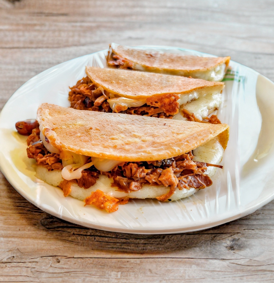 Quesadilla con 180gr birria sicronizada de Harian ó maiz. Incluye salsa y verdura