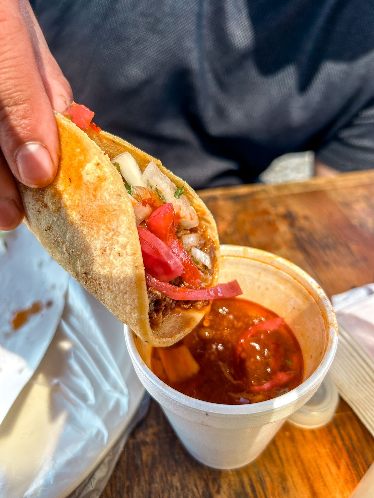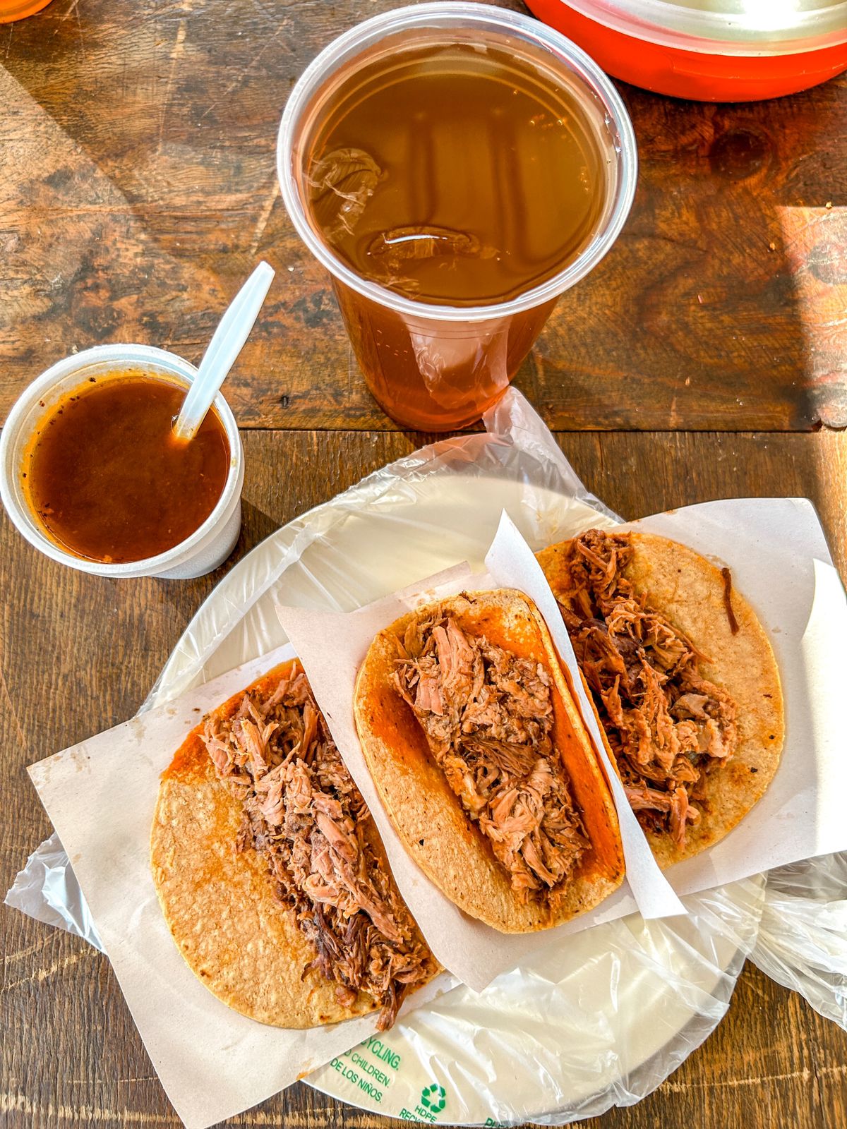 Vaso de 600 ml con jugo y (120gr) carne de birria acompañado de 4 tortillas. Incluye verdura y salsa (salen aproximadamente 2 tacos)