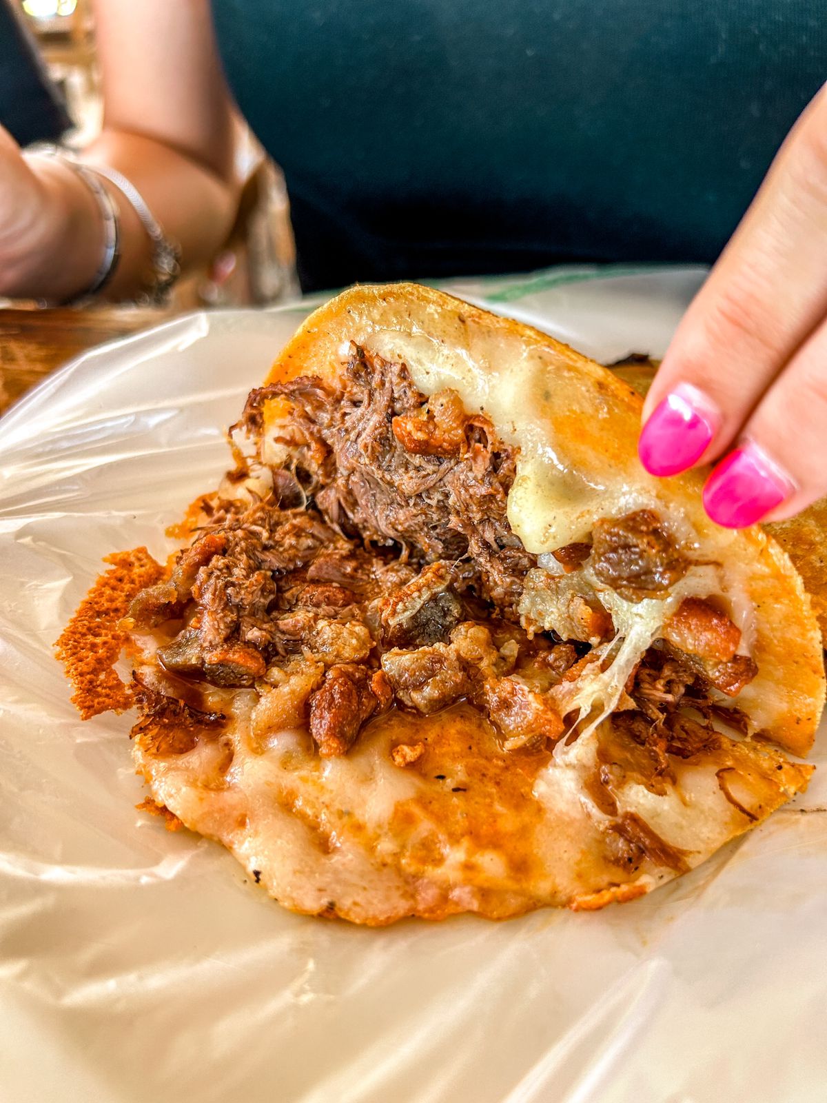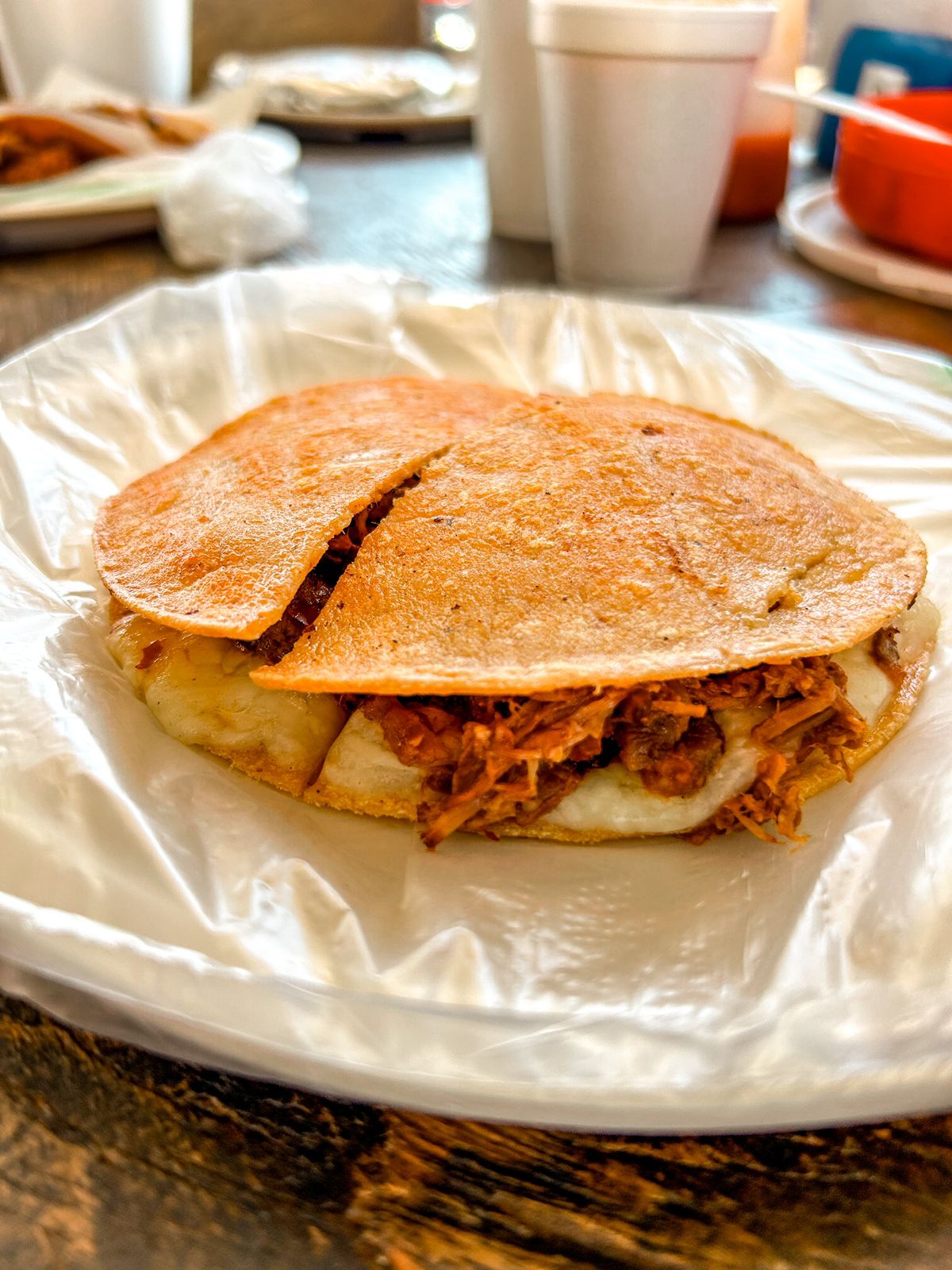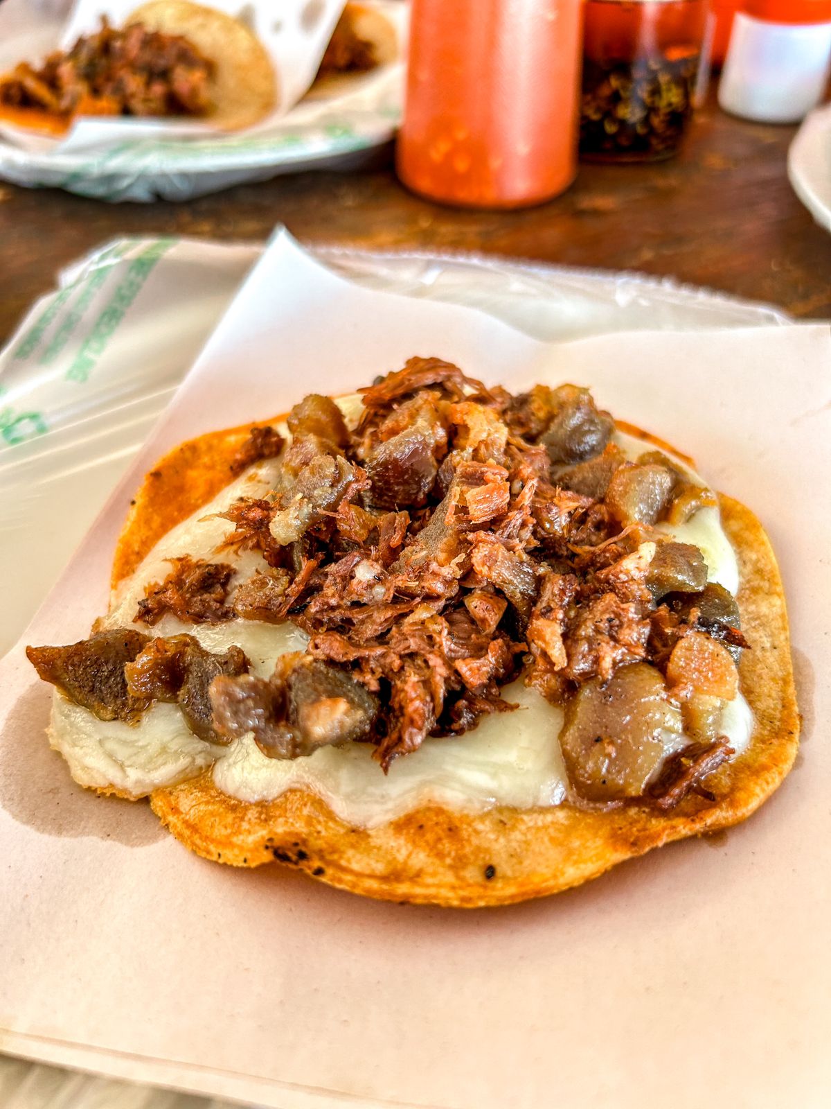 Tostada de birria de res y queso, Viene con salsa y verdura aparte
