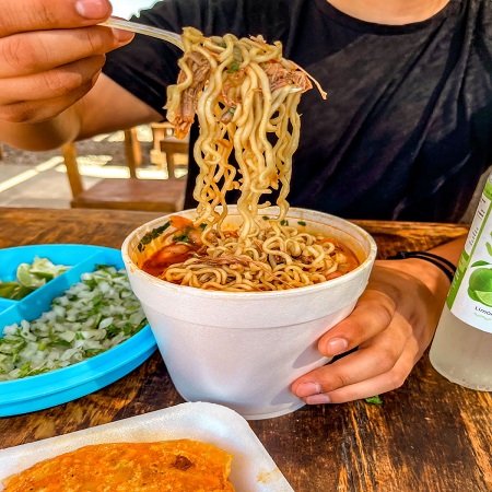 Vaso personal con caldo y 190gr carne de Birria acompañado de sopa Ramen. Incluye verduras y salsa aparte (No incluye tortillas)