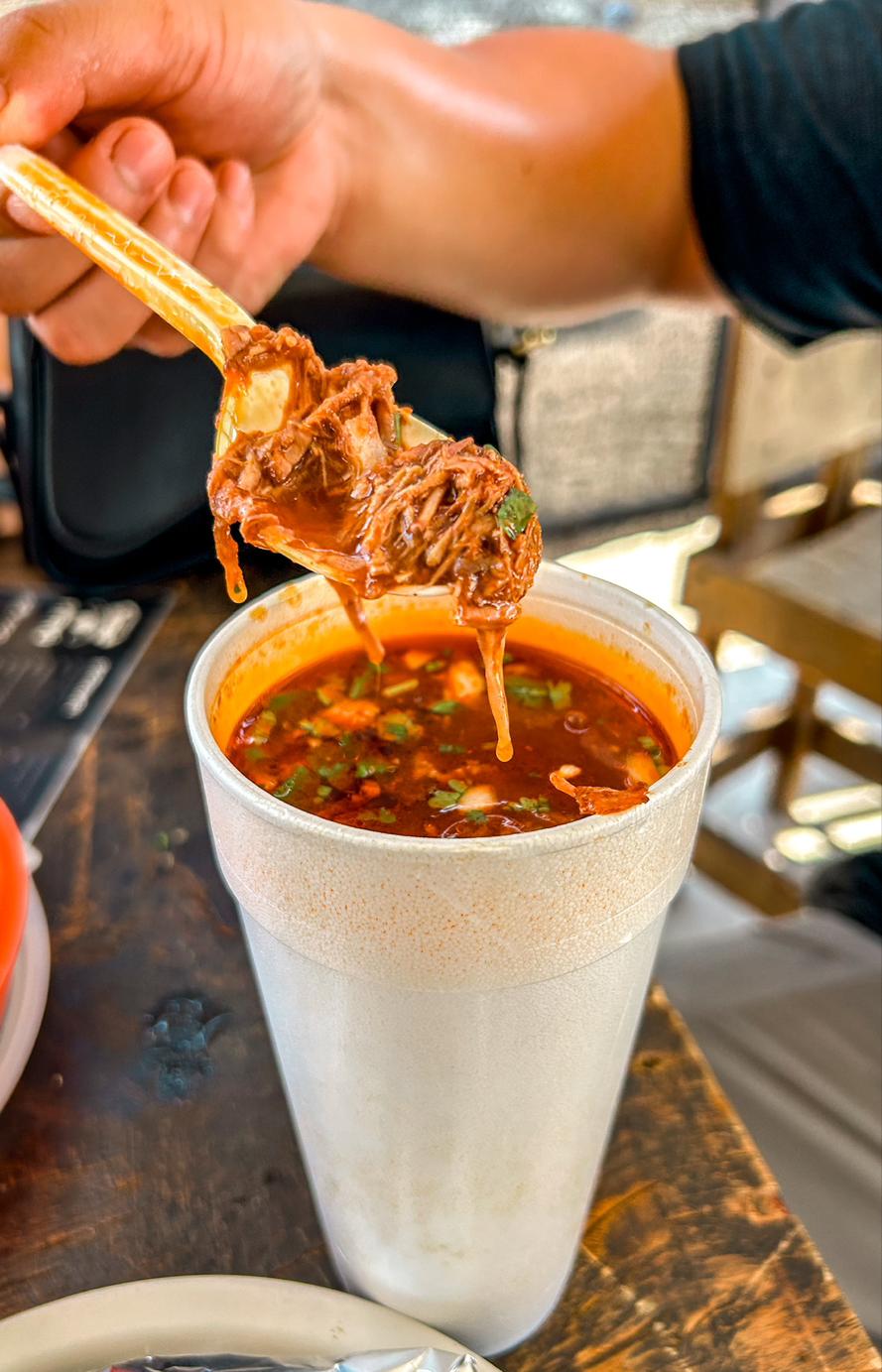 Vaso de 700 ml con jugo y 185gr) carne de birria acompañado de 6 tortillas. Verduras y salsas aparte