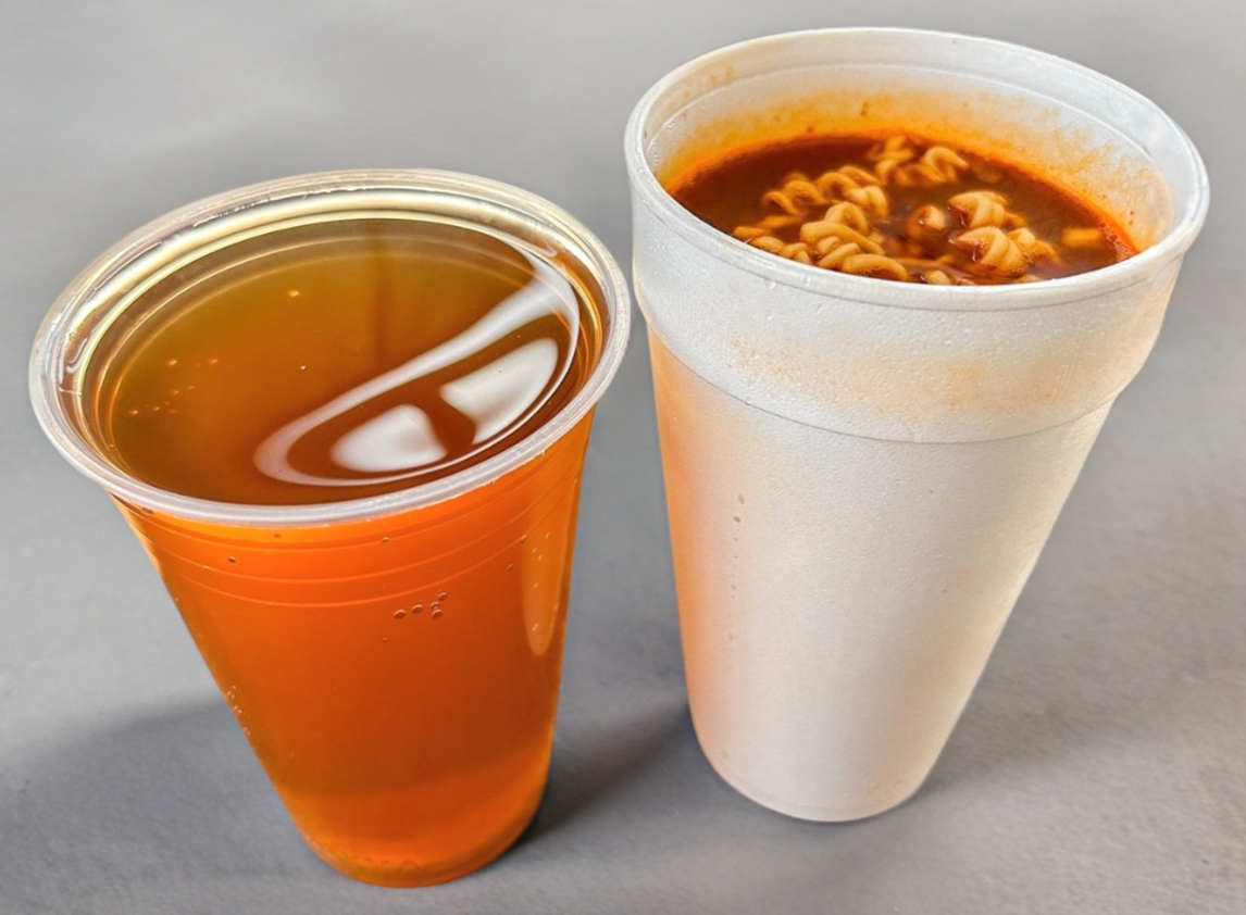 Vaso con caldo y 95gr carne de Birria acompañado de sopa Ramen. Incluye verduras y salsa aparte (No incluye tortillas)