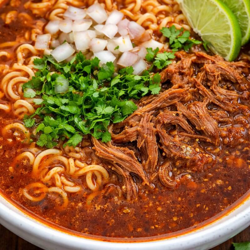150gr de carne de birria con jugo acompañado de ramen y queso (incluye verduras y salsa) con 3 tortillas