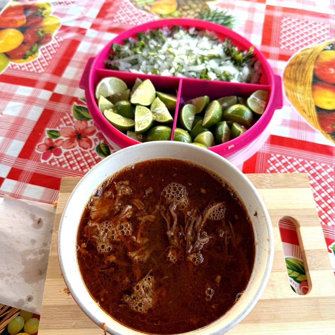 190gr de carne de birria con jugo acompañado de verdura,salsa y limones con 5 tortillas