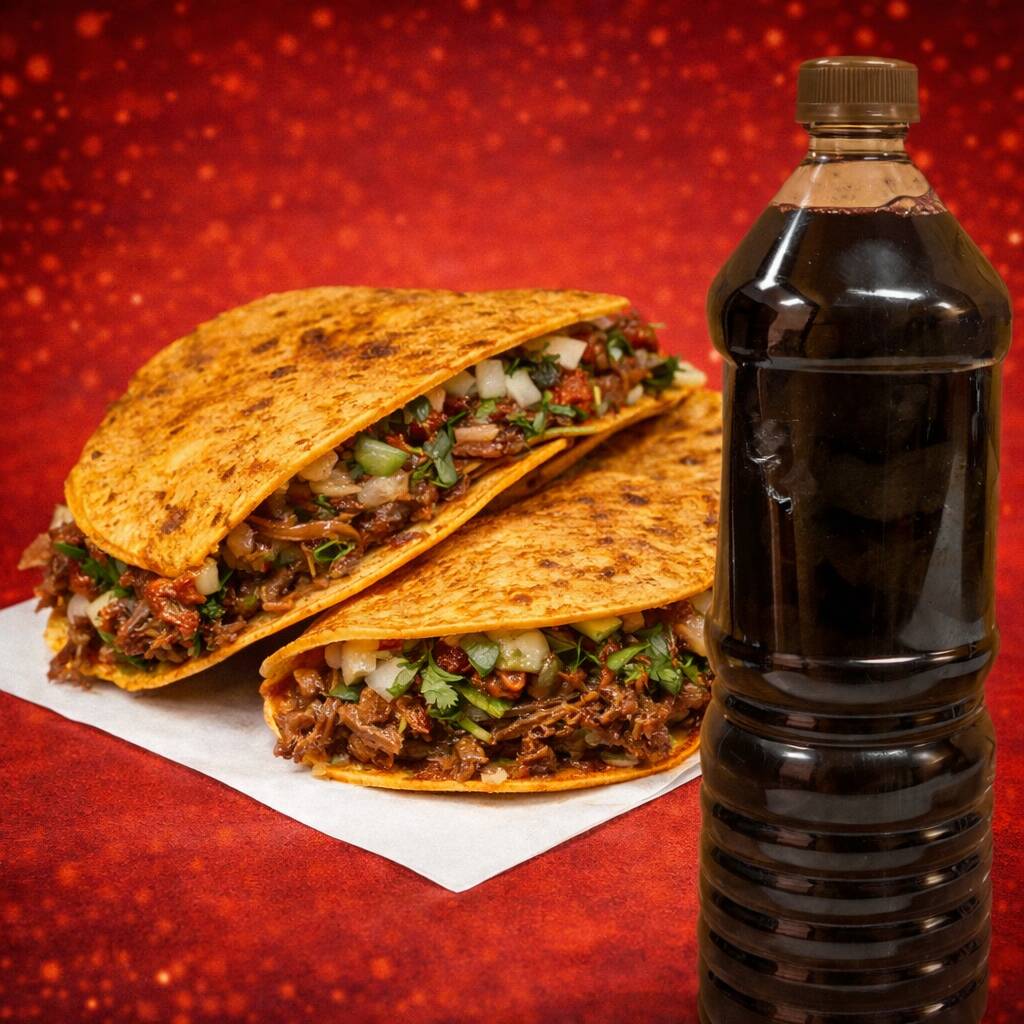 3 Tacos de Birria (bien reportados), Papitas y Bebida de tu elección.