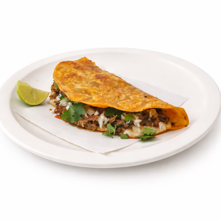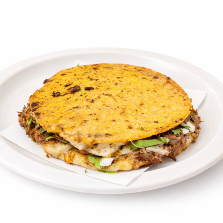 Deliciosa Mulita de dos tortillas Salseadas con Carne Birria de res y Queso fundido