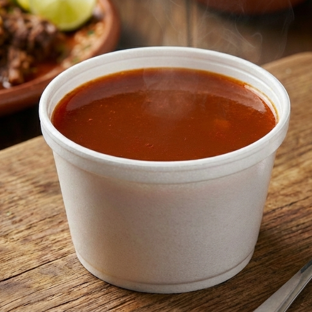 450 ml de consome de birria de res servidos en un vaso de unicel con tapa