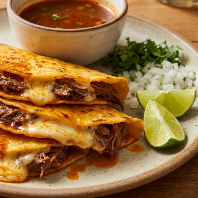 Quesadilla dorada con birria de res y queso Monterrey