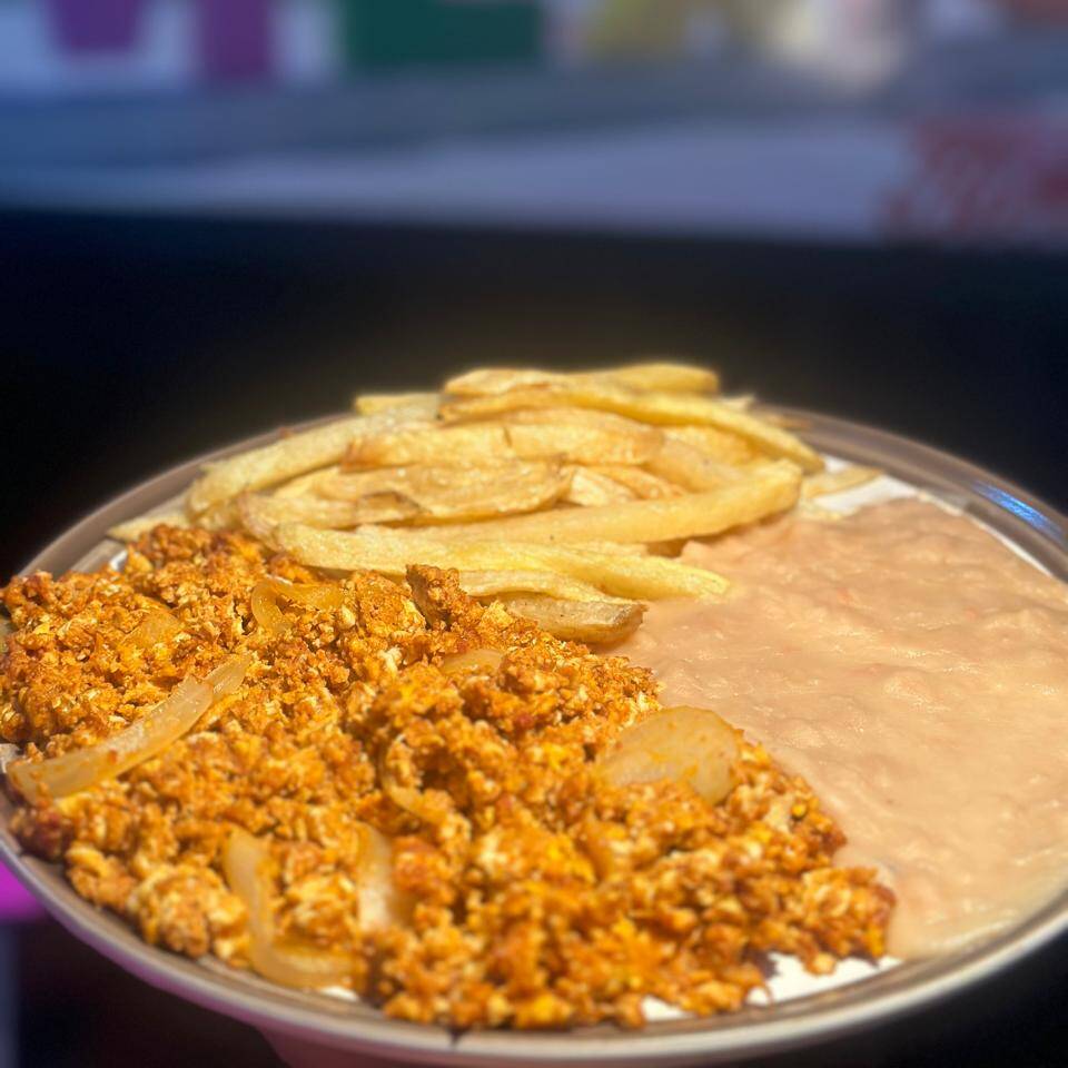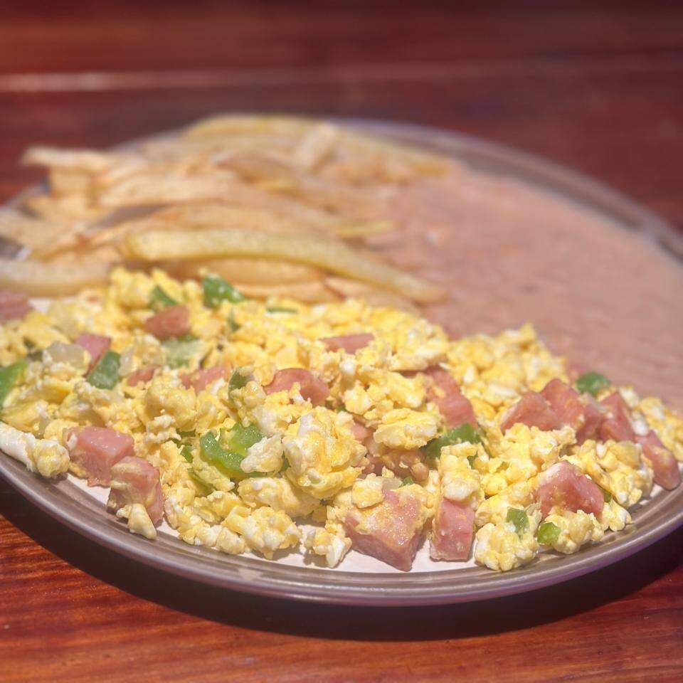 3 Huevos, cubitos de jamón, cebolla y morrón acompañado con frijoles y papas.