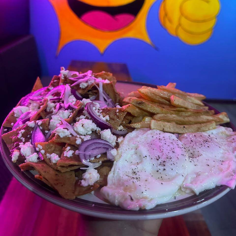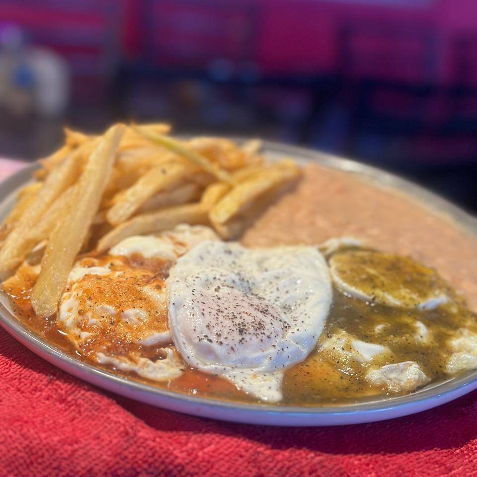 Chilaquiles verdes o rojos acompañados con 2 huevos frijoles y papas.
