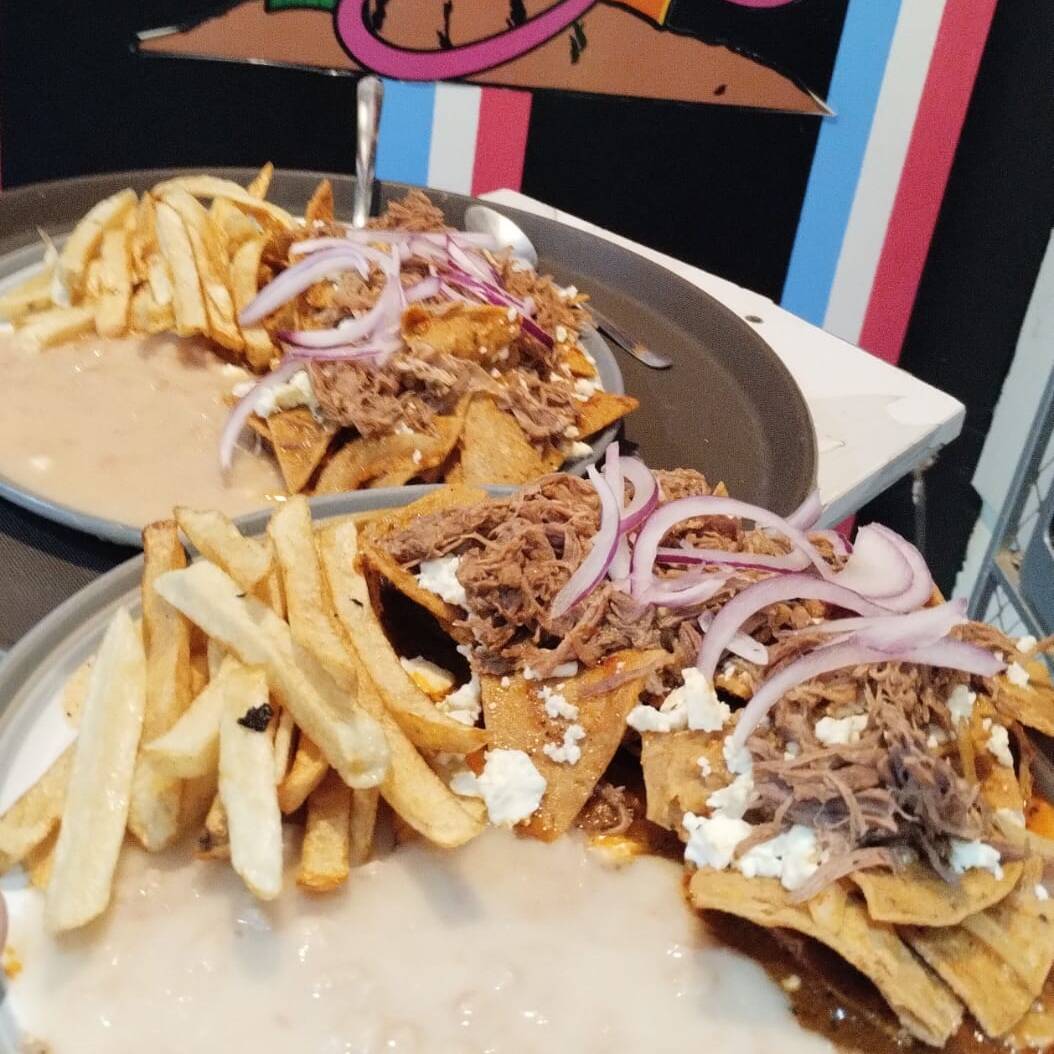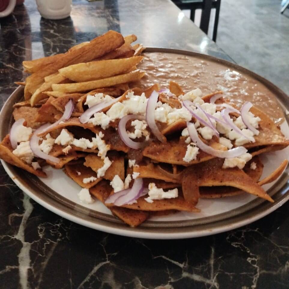 Birriaquiles acompañado con frijoles y papas.