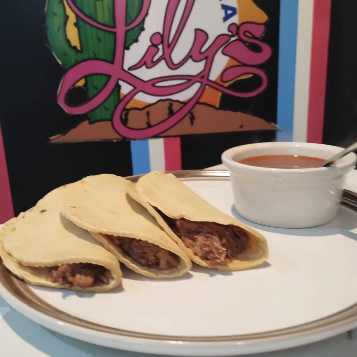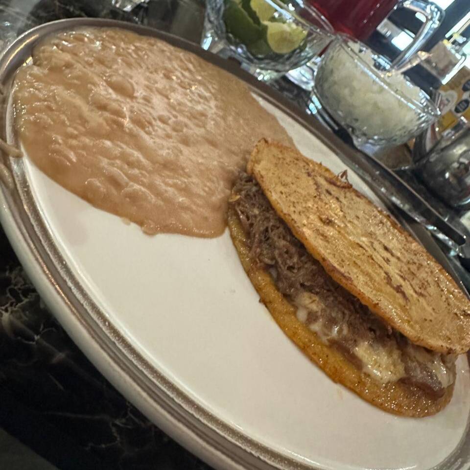 Quesabirria de maiz acompañada de frijol.