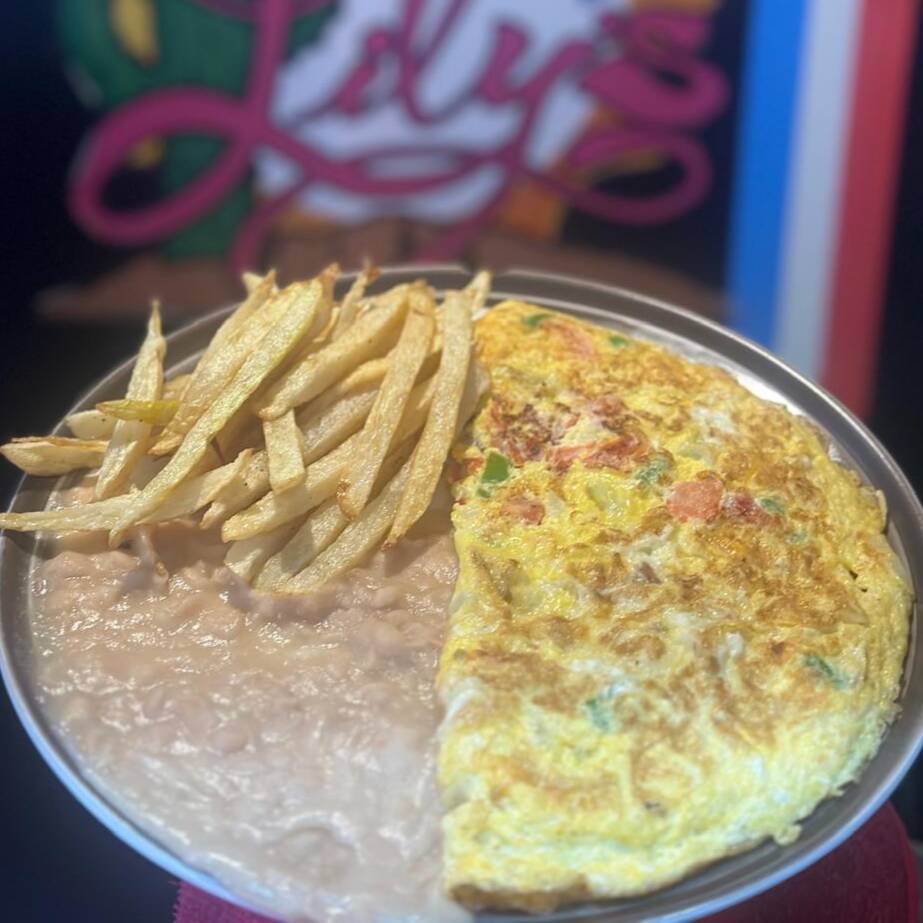 Omelette con vegetales y queso acompañado con frijoles y papas.