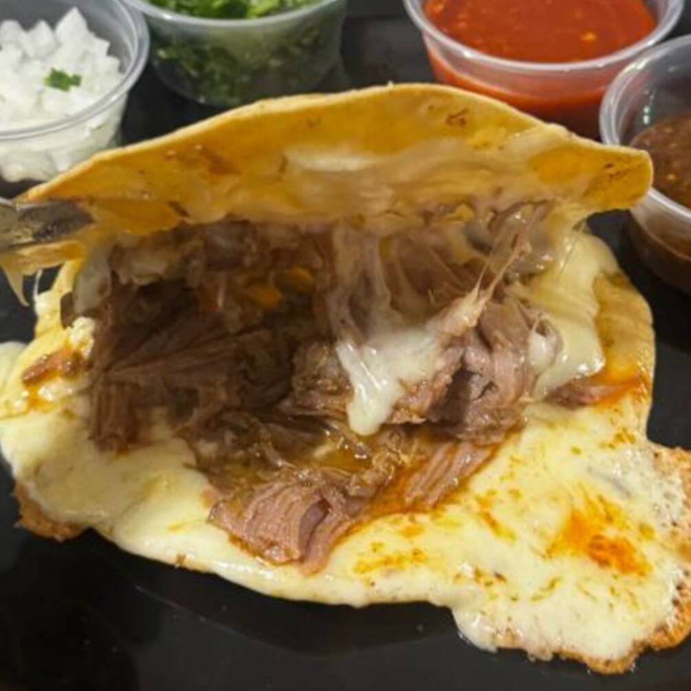 Tortilla de maiz doradita con una base de queso rellena de birria de res con nuestra receta original