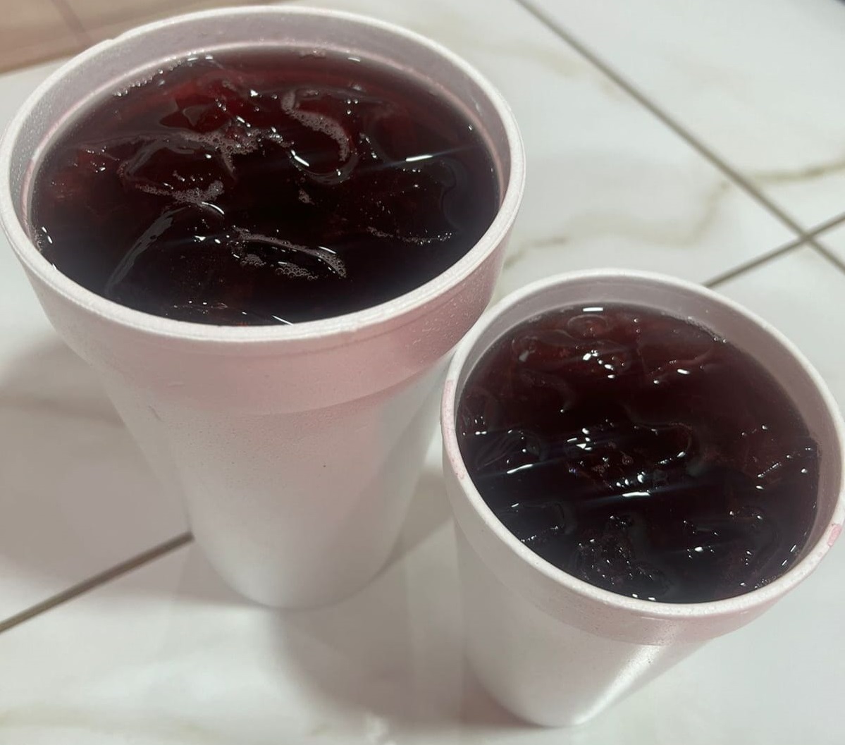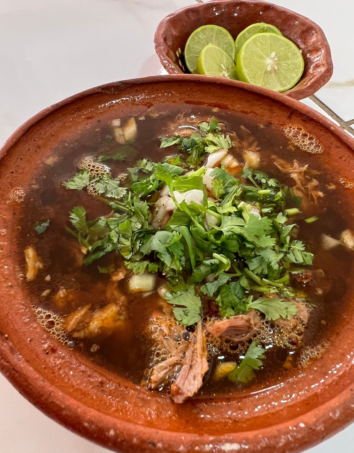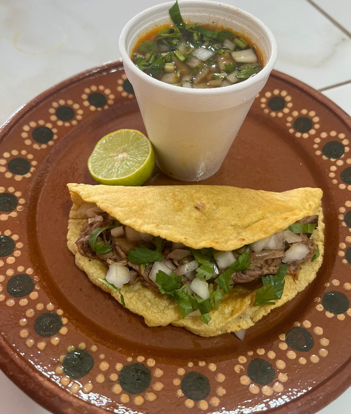 Vaso de 1/2 litro de jugo con carne de birria, acompañado de cilantro, cebolla, limón, salsa roja y 3 tortillas de maíz grandes.