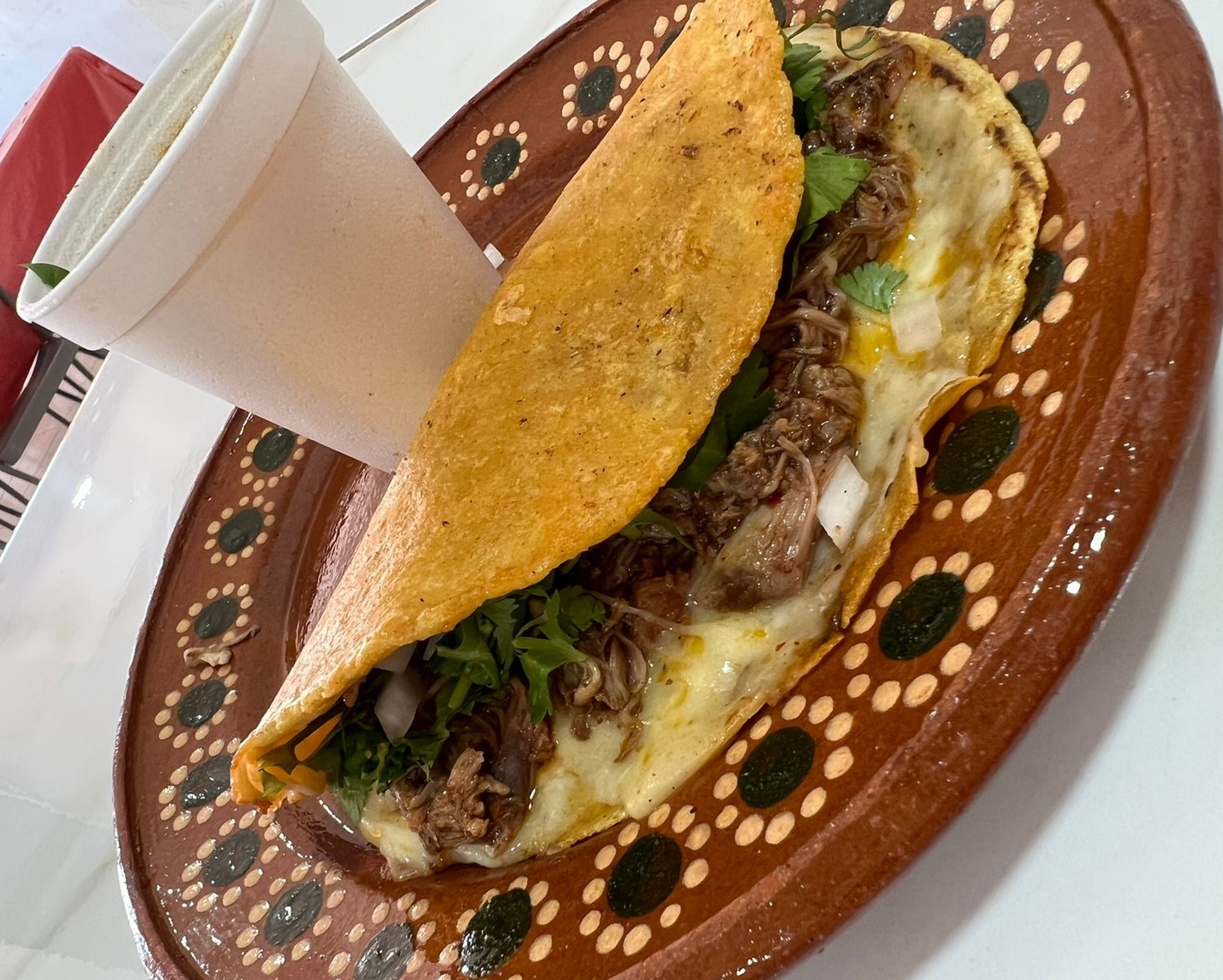 Tortilla grande de maíz con queso Monterrey Jack, acompañada de cebolla, cilantro, limón, salsa roja y 1 consomé de birria de 6 oz.