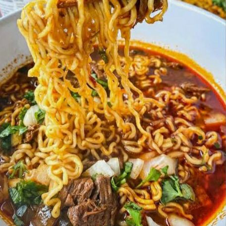 Birriamen con Deliciosa y Picosita Pasta ramen, Preparada con consomé y Mucha carne 3 piedras.