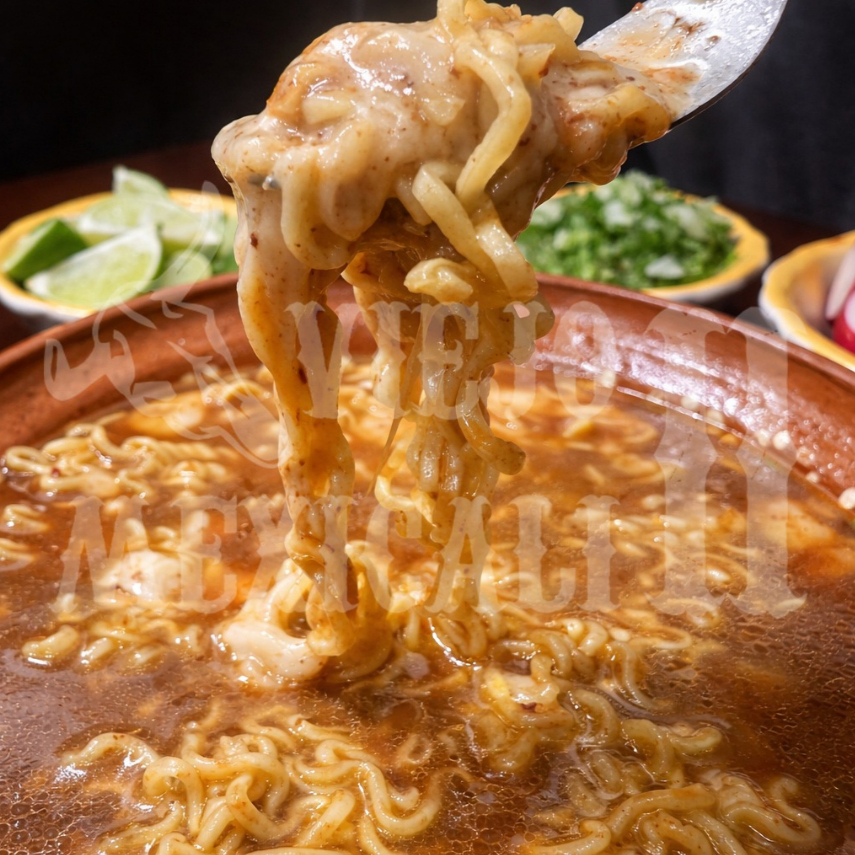 Carne de birria de res con jugo y fideos ramen gratinados con queso monterrey, acompañado con cebolla y cilantro, repollo con rábanos, limones y salsa macha servidas aparte.