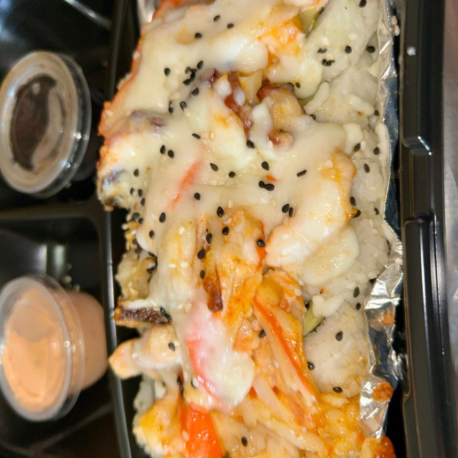 Rollo con alga, pepino, aguacate, queso crema, res, camaron, forrado de queso americano y queso monterrey
