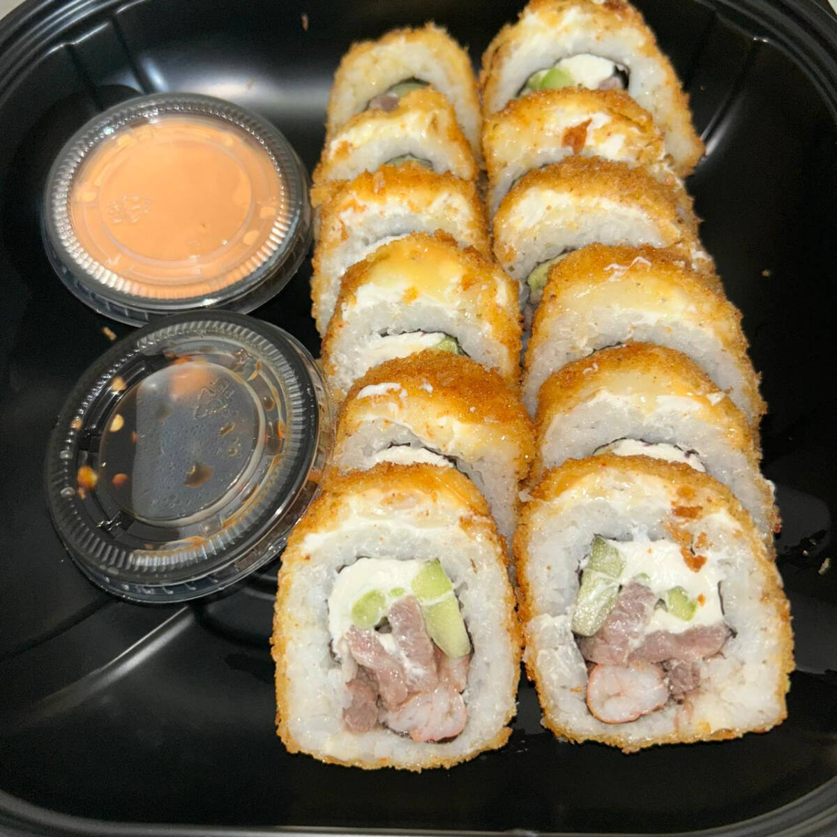 Rollo con alga, pepino, aguacate, queso crema, camaron empanizado. Forrado de queso crema y topping de tampico