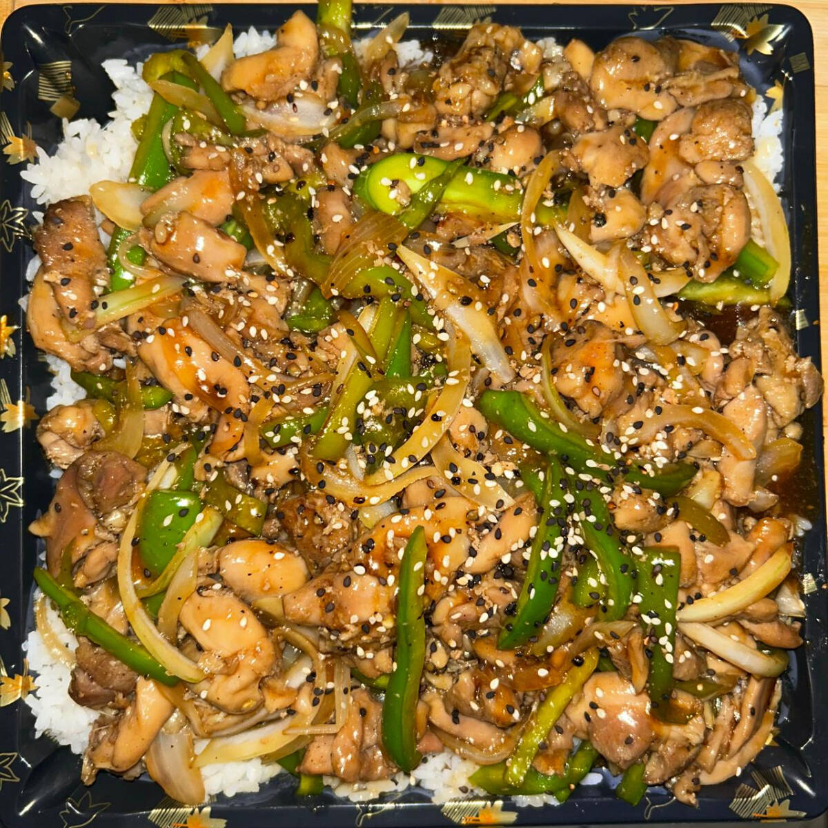 Cama de arroz yakimeshi, cebolla, chile morron, pollo y bañado en salsa teriyaki
