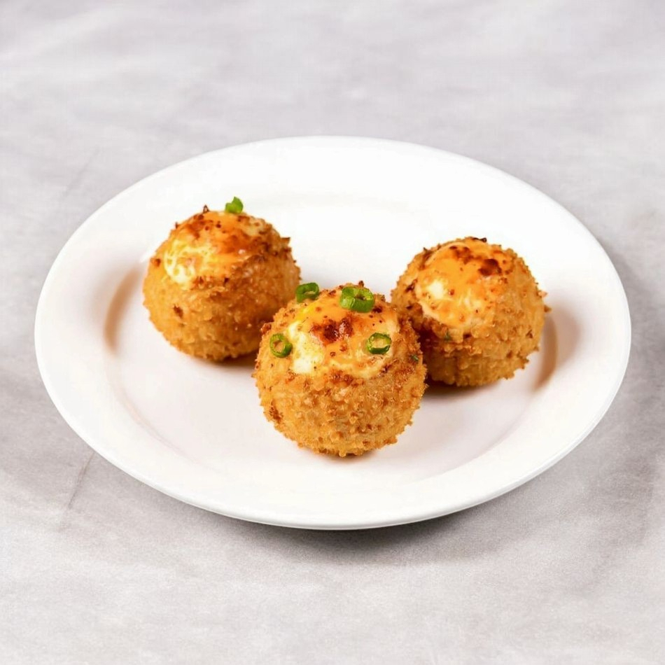 4 Piezas de bolitas rellanas de queso crema, queso monterrey, sriracha y tampico, empanizadas