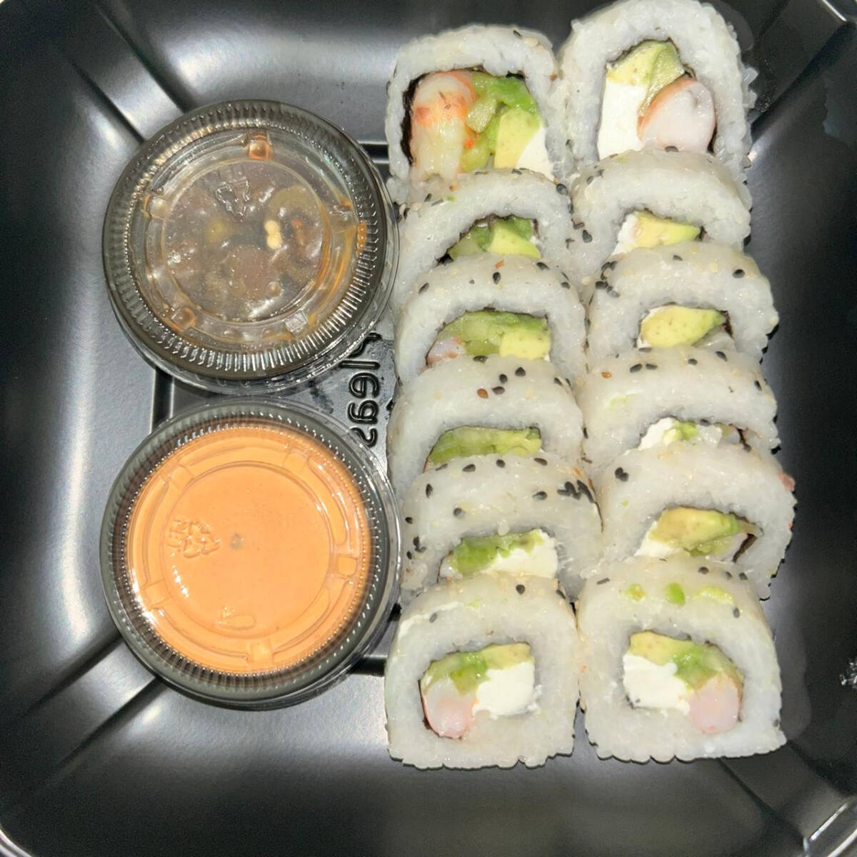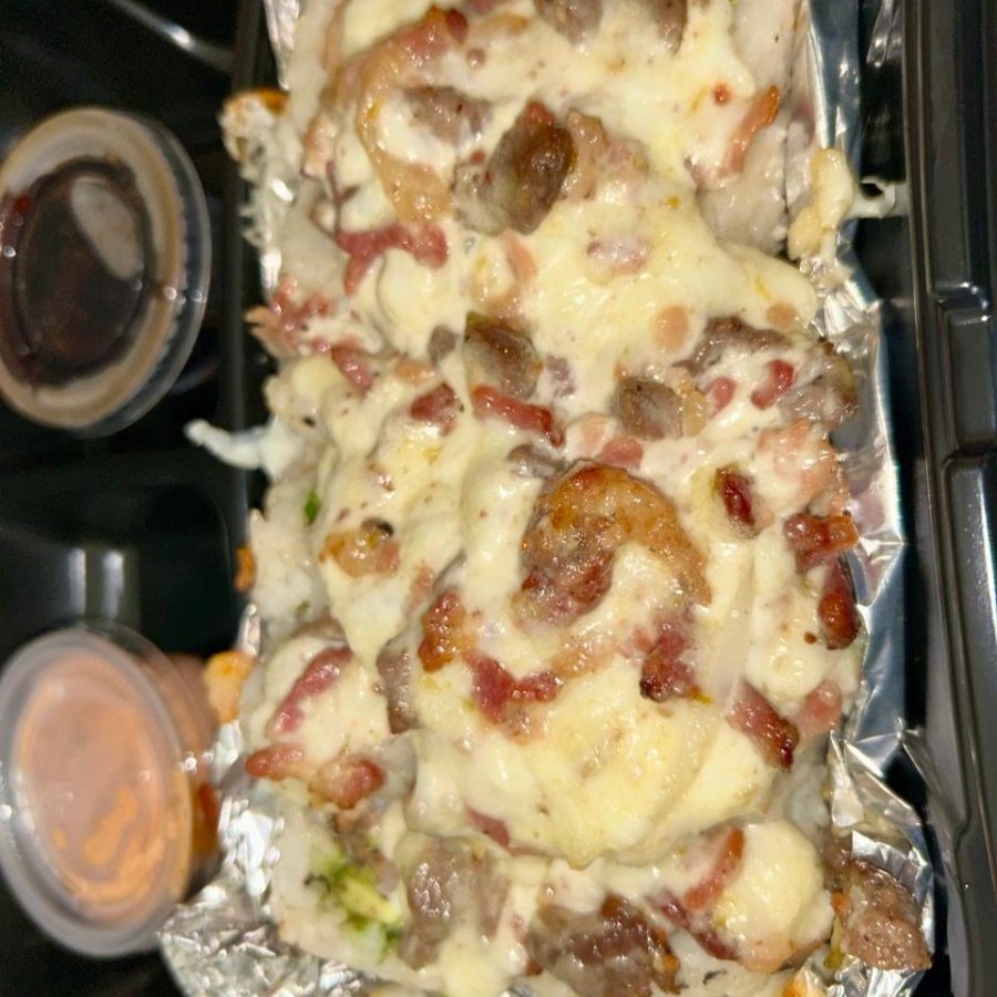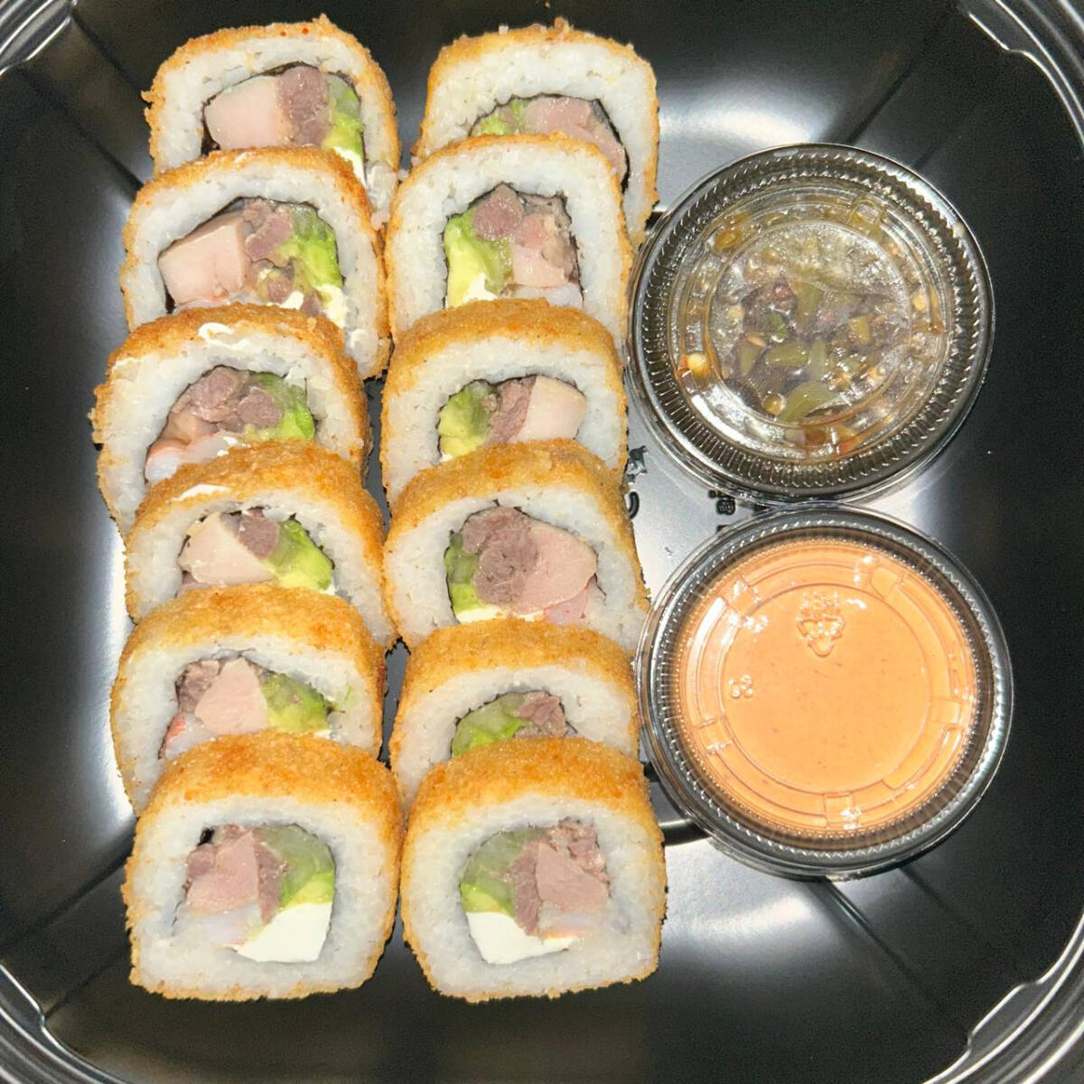 Rollo con alga, queso crema, pepino, aguacate, pollo y cebollin con topping de carne tocino y queso monterrey con aderezo jalapeño