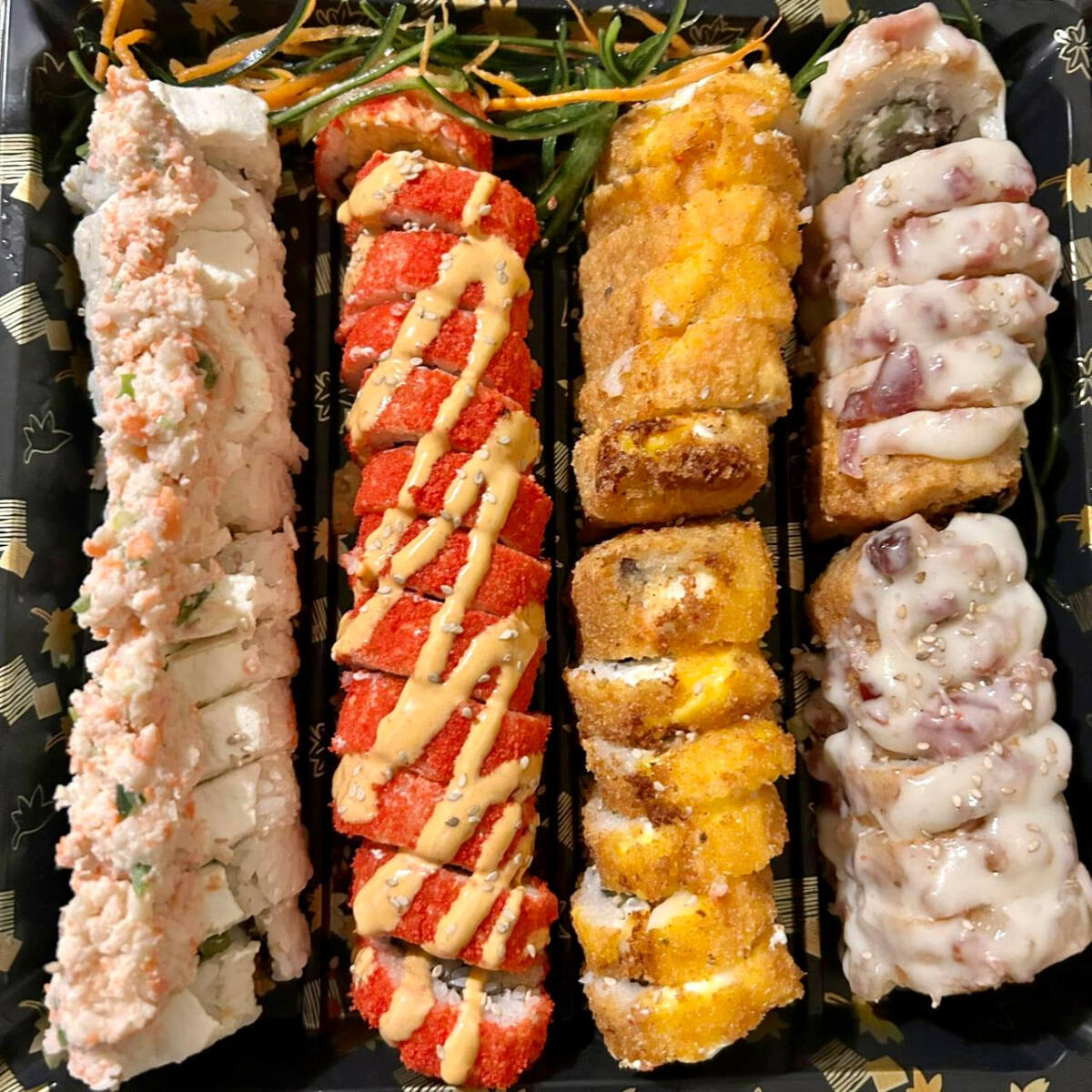 4 Rollos, 2 empanizados y 2 naturales (Flaming Roll, Nevado Roll, Beef Roll, 3 Quesos Roll)