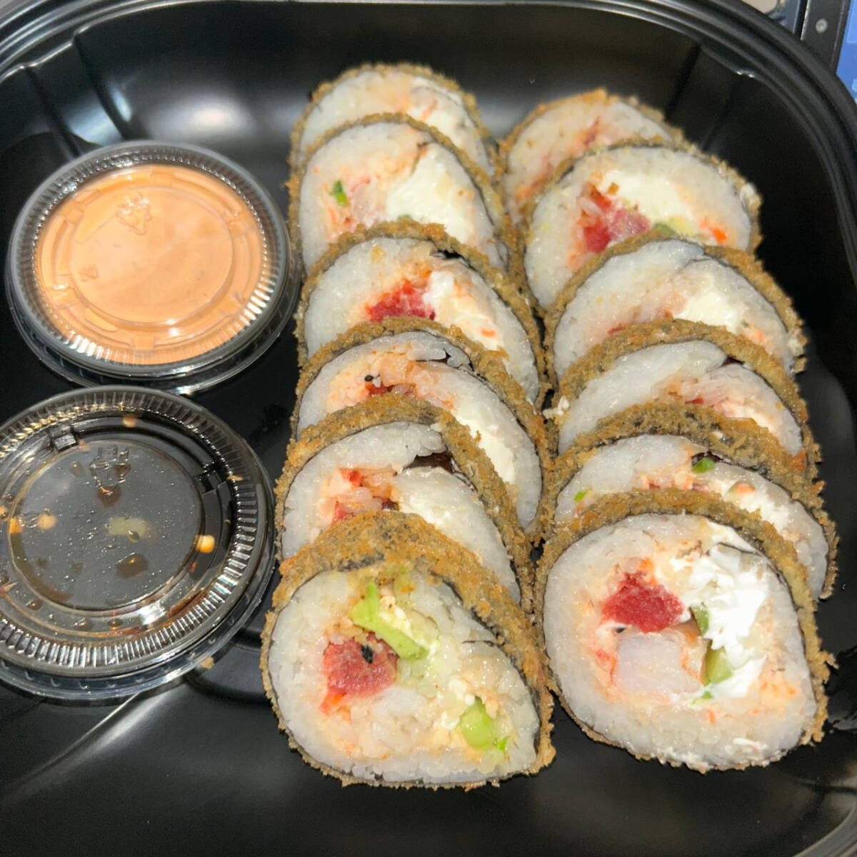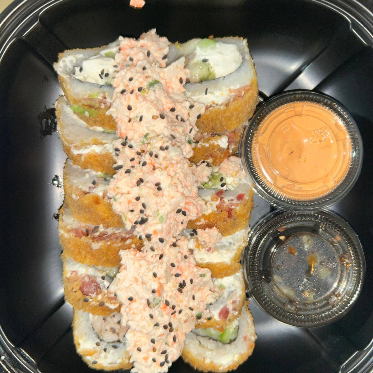 Rollo con alga, pepino, aguacate, queso crema, surimi con topping de atun en salsa spicy