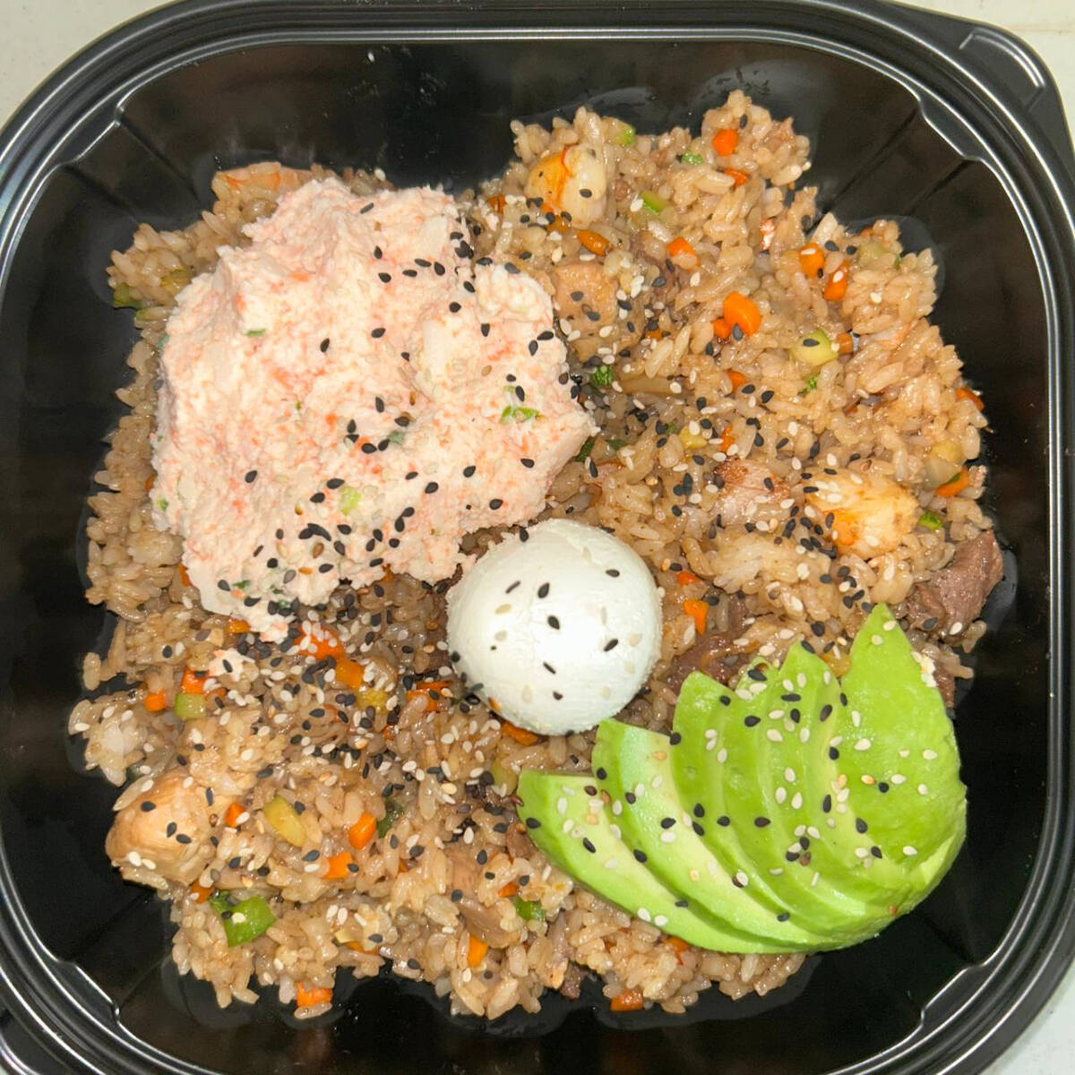 Arroz yakimeshi preparado con res, pollo, camaron, zanahoria y calabaza. Topping de aguacate, tampico y queso crema