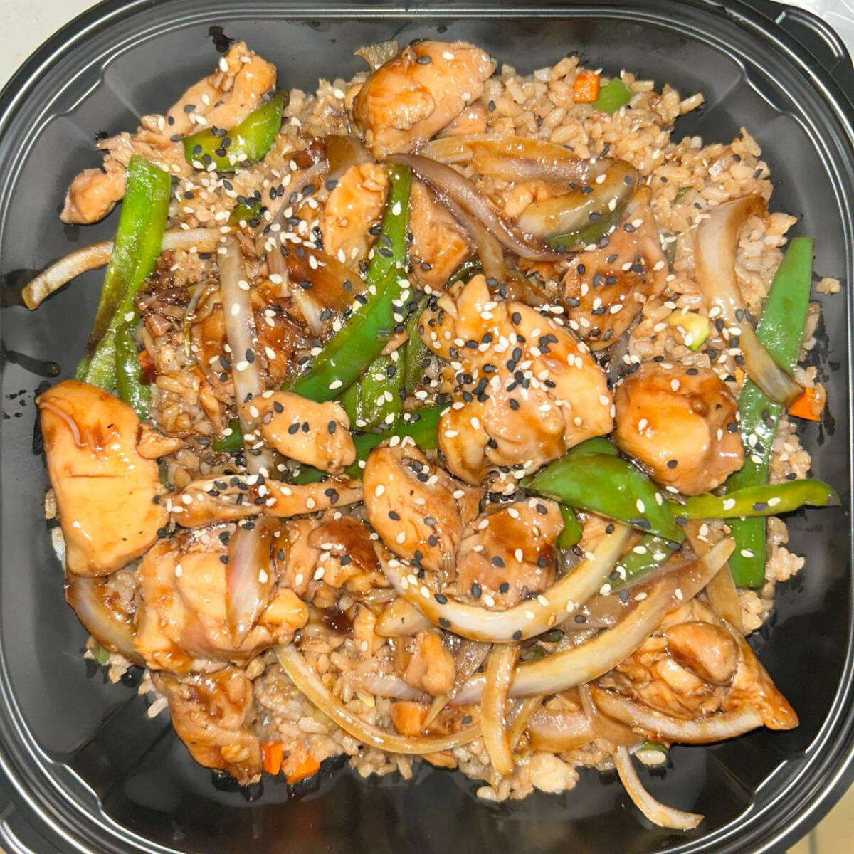 Cama de arroz Blanco con Cebolla, Chile Morron, Pollo y bañado en salsa Teriyaki