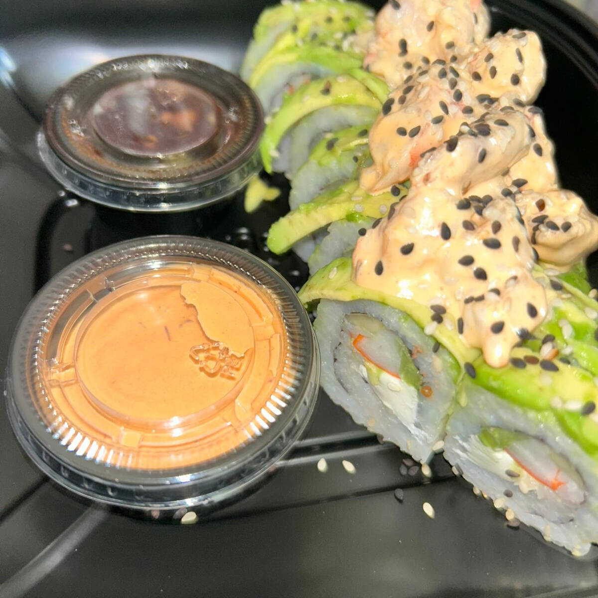 Rollo con alga, pepino, aguacate, queso crema y surimi, forrado de aguacate y topping de camaron spicy