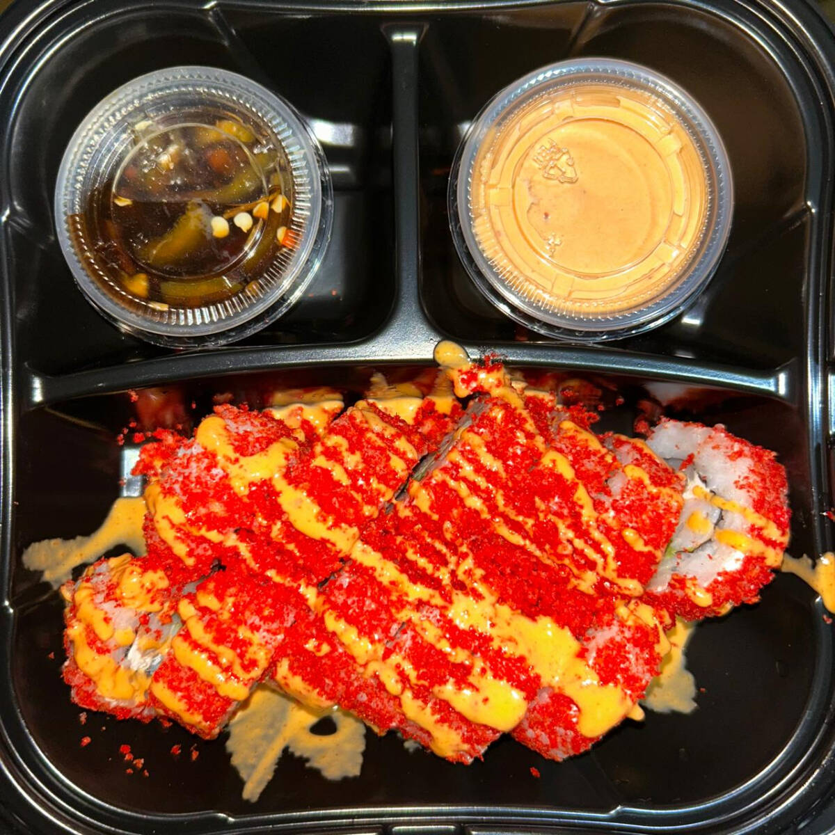 Rollo con alga, pepino, chile serrano, aguacate, queso crema, camaron por fuera forrado en cheetos flaming hot