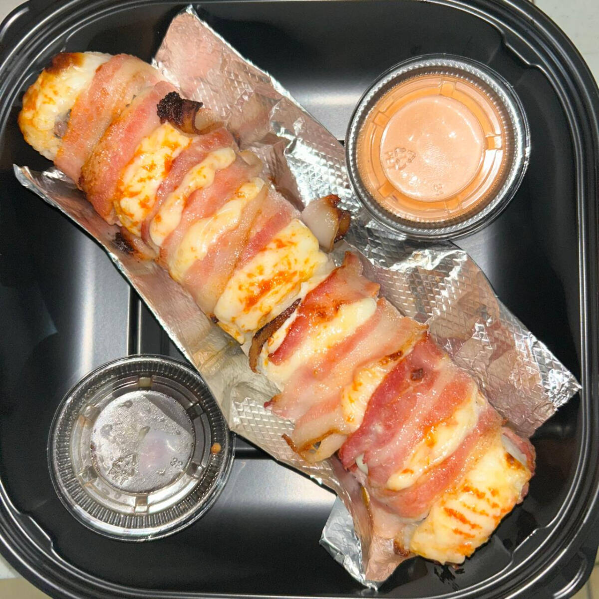 Rollo con alga, queso crema, cebollin, camaron, res, forrado en queso monterrey y envuelto en tocino