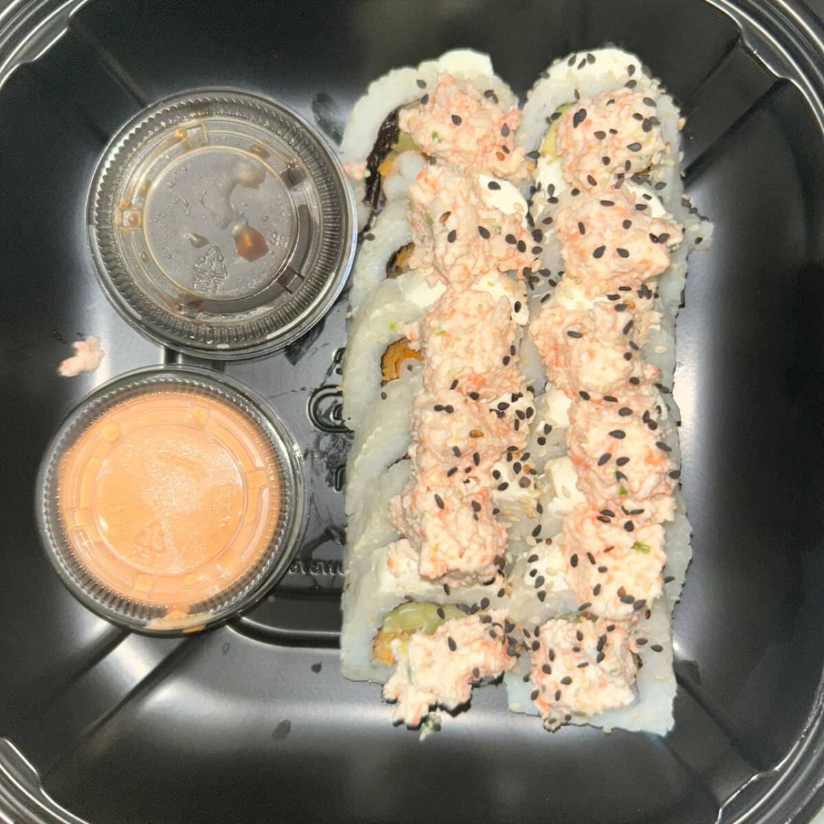 Rollo con alga, pepino, aguacate, queso crema, surimi con topping de camaron spicy